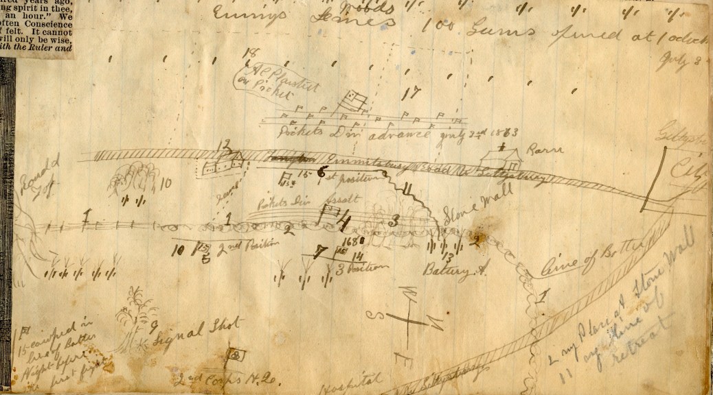 Our Brigade was not over 1,000 and the 15th [Massachusetts] flag was the first to advance though Gen. [Norman J.] Hall called out as we started for the wall, “Forward, that there color!” I thought it was one of his regiments and history gives to credit [writing illegible] which is false …of my company and in fact [ ] that I was at the wall myself and that [ ] was with my regiment and brigade and that the 15th [Mass.] flag was first to advance is clear proof that we done that job through a flank fire on the enemy’s right. The continuous [weakening?] all round had much to do towards making our advance to have effect. Yet what must have been had we not charged is uncertain. Surely at that moment it looked very much as though the enemy would hold this ground gained and perhaps win the day.