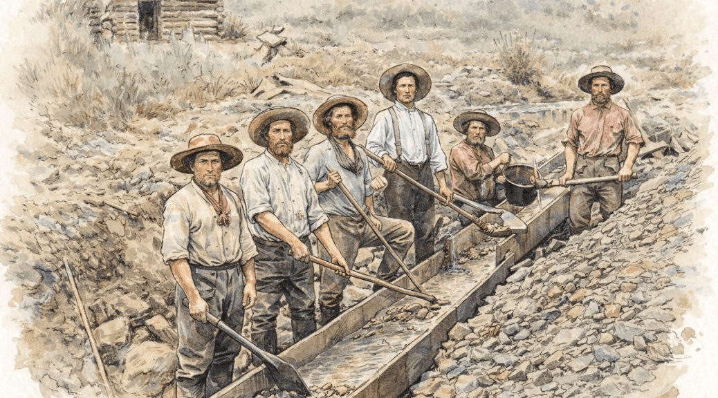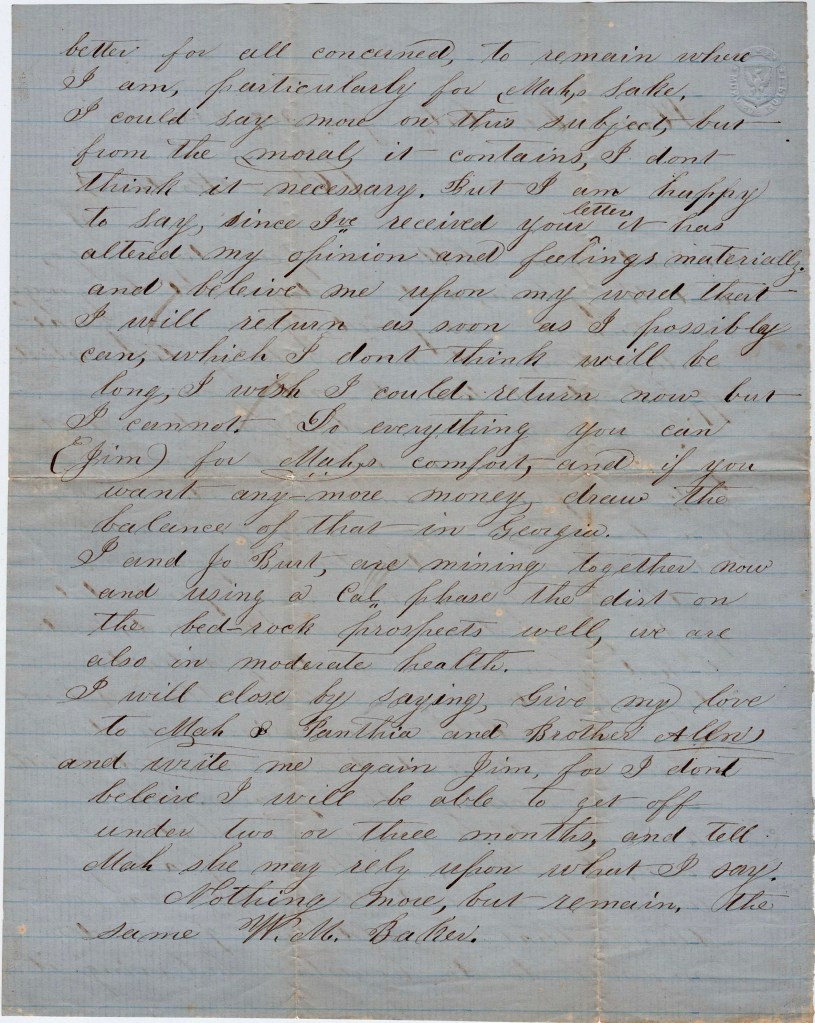 I and Jo Burt are mining together now and using a California phase. The dirt on the bedrock prospects well. We are also in moderate health. I will close by saying give my love to Ma and Panthia and brother Allen and write me again, Jim, for I don’t believe I will be able to get off under two or three months. And tell Ma she may rely upon what I say. Nothing more but remain the same. — W. M. Baker