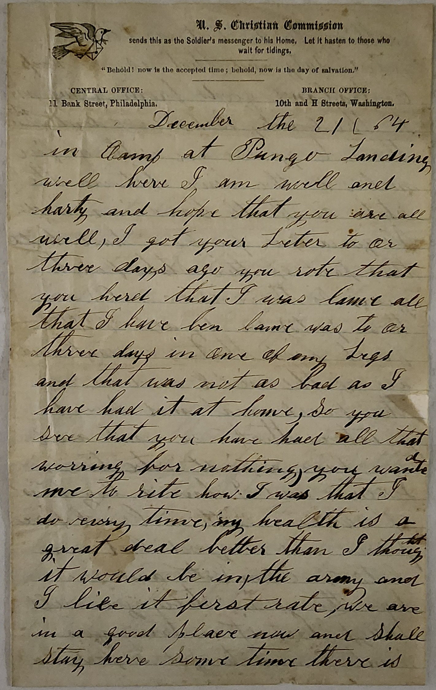 Well, here I am, well and hearty, and hope that you are all well. I got your letter two or three days ago. You wrote that you heard that I was lame. All that I have been lame was two or three days in one of my legs and that was not as bad as I have had it at home. So you see that you have had all that worrying for nothing. You wanted me to write how I was. That I do every time [I write]. My health is a great deal better than I thought it would be in the army and I like it first rate.