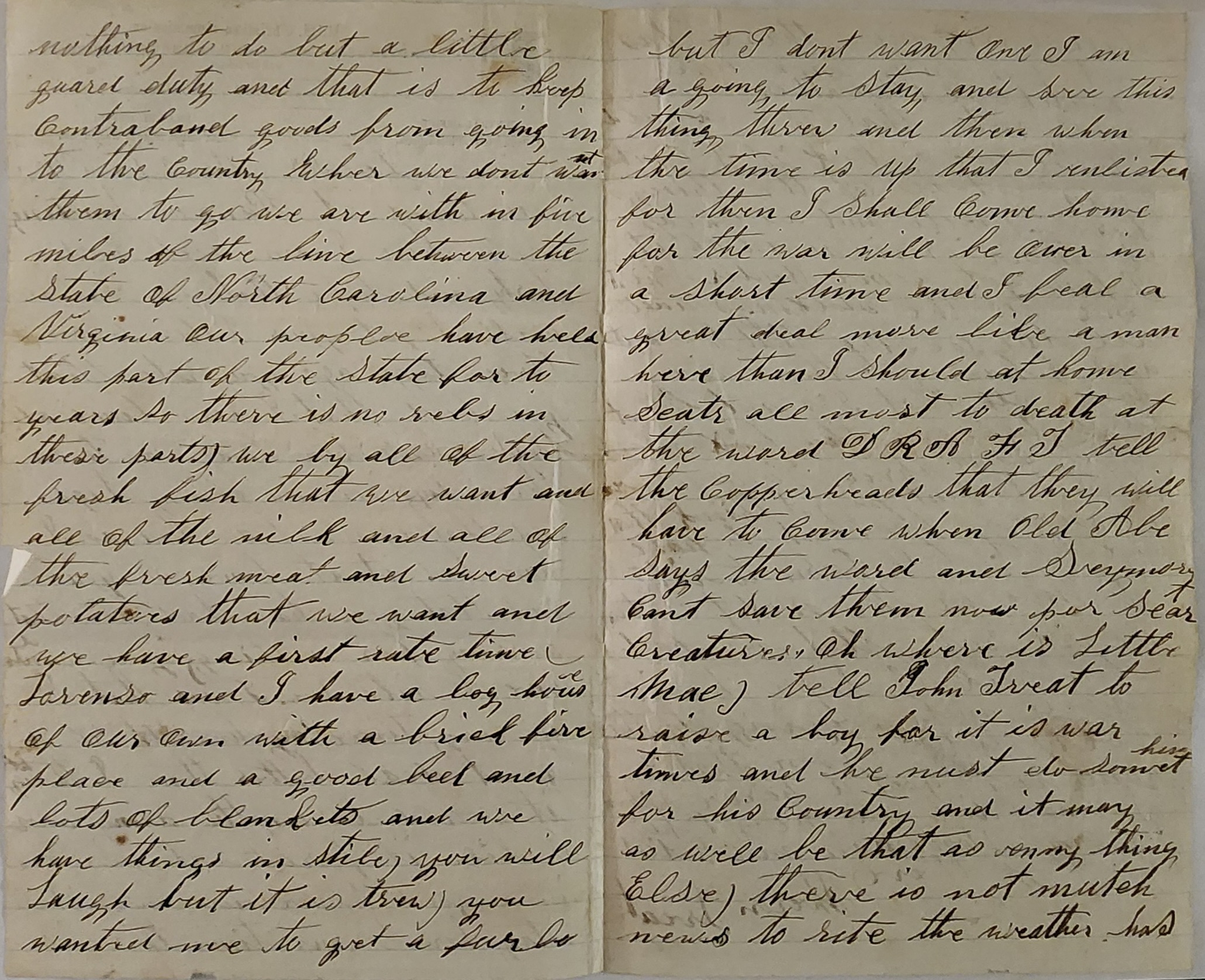 We are in a good place now and shall stay here some time. There is nothing to do but a little guard duty and that is to keep contraband goods from going into the country where we don’t want them to go. We are within five miles of the line between the states of North Carolina and Virginia. Our people have held this part of the state for two years so there is no rebs in these parts. We buy all of the fresh fish that we want and all of the milk and all of the fresh meat and sweet potatoes that we want, and we have a first rate time.