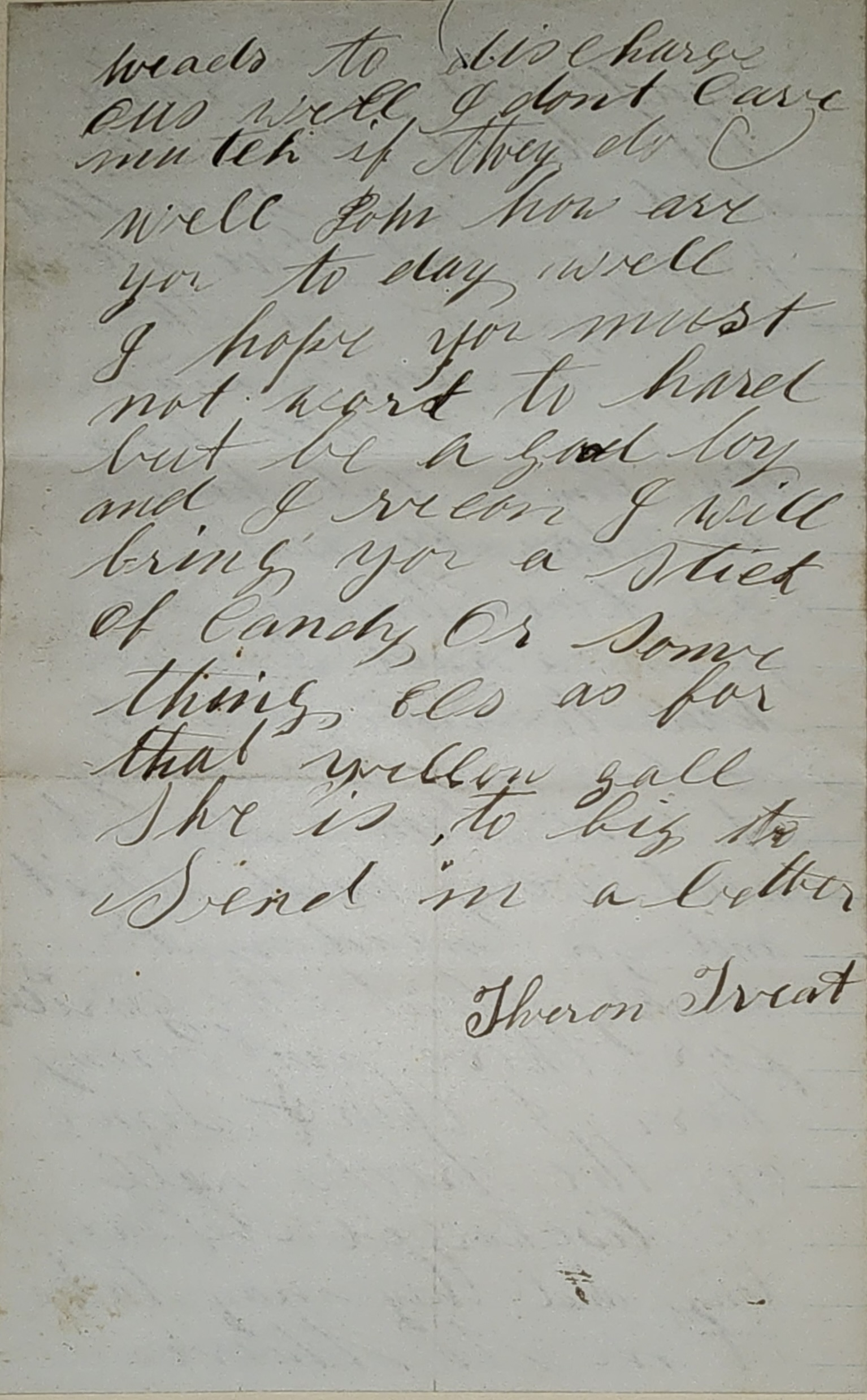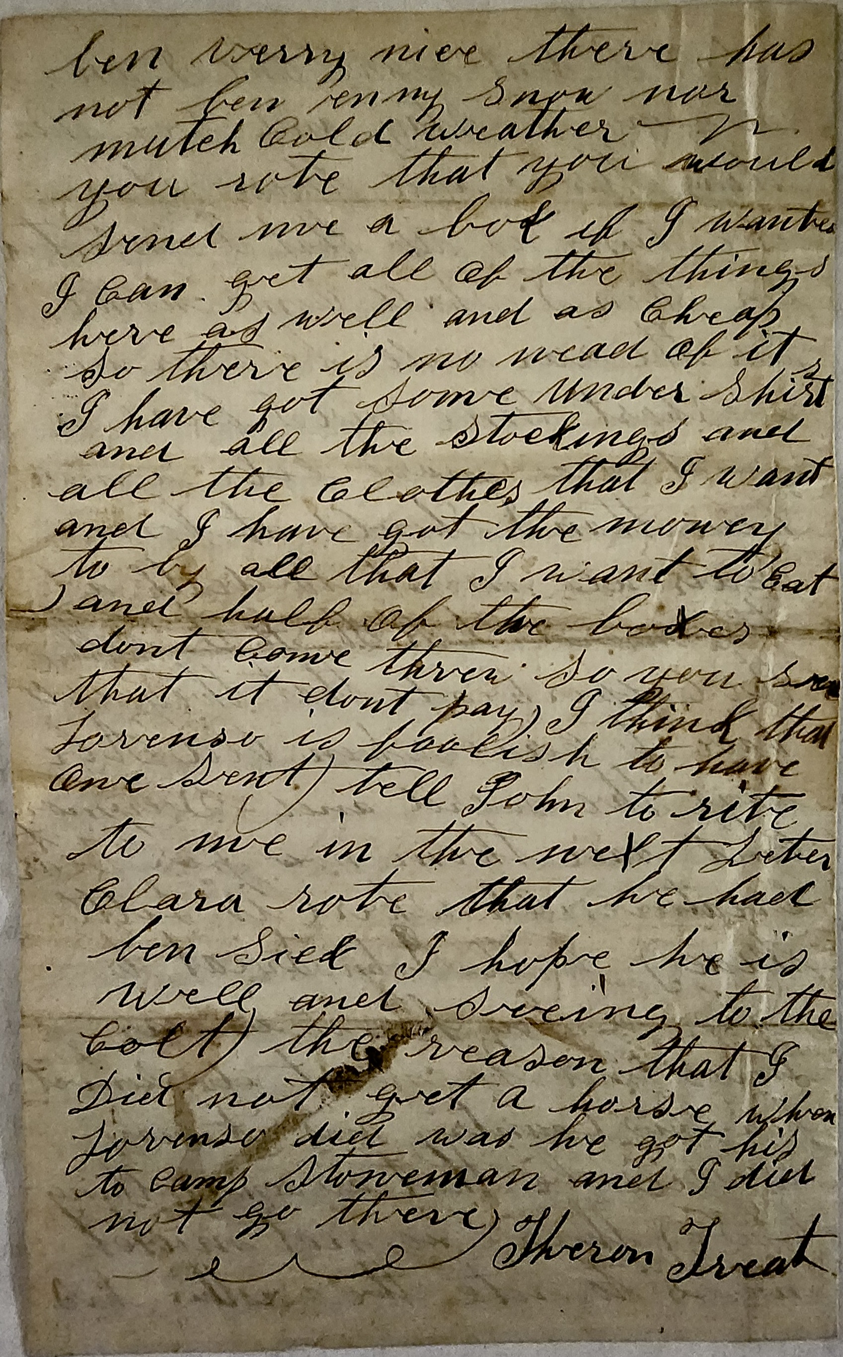 You wrote that you would send me a box if I wanted. I can get all of the things here as well and as cheap so there is no need of it. I have got some undershirts and all the stockings and all the clothes that I want and I have got the money to buy all that I want to eat. And half of the boxes don’t come through [anyway] so you see that it don’t pay. I think that Lorenzo is foolish to have one sent. Tell [brother] John to write to me in the next letter. Clara wrote that he had been sick. I hope he is well and seeing to the colt. The reason that I did not get a horse when Lorenzo did was he got his to Camp Stoneman and I did not go there. — Theron Treat