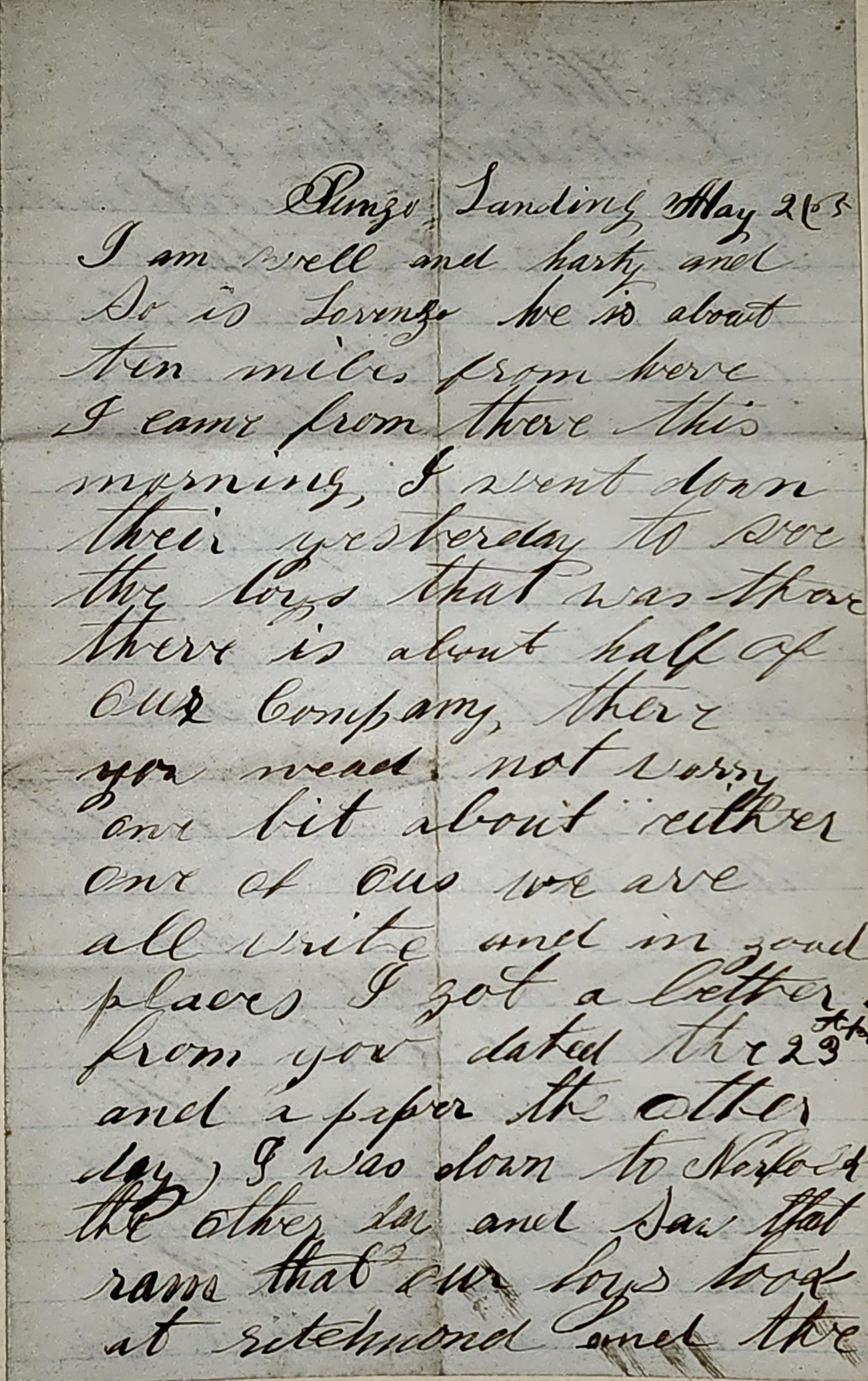 I received your letter this afternoon. We are now encamped right in front of the enemy’s works. The 4th we left our camp at Newport News, the right of the army moving in the direction of Big Bethel & the left up on James river in the direction of Warwick. We are on the left.