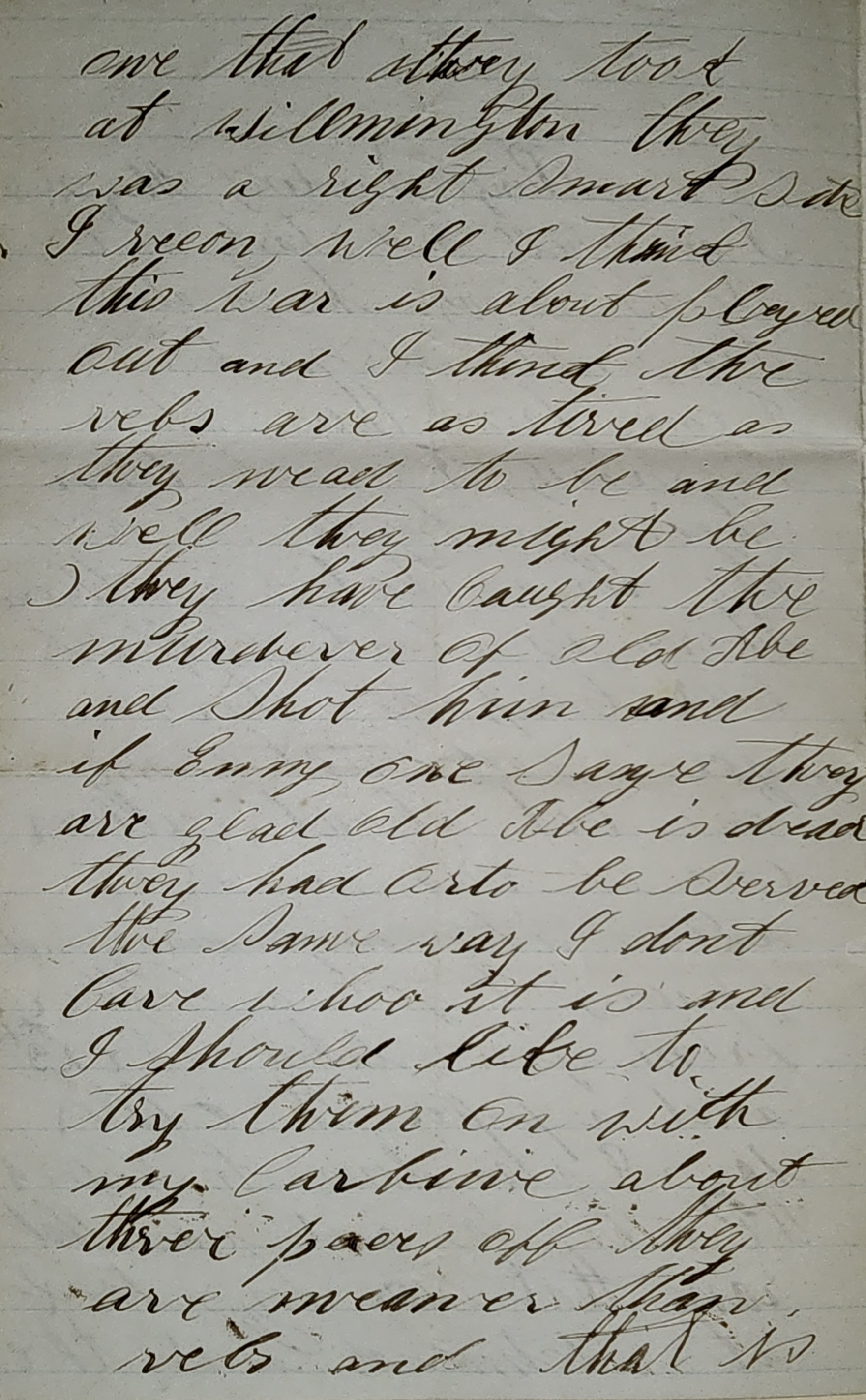 Well, I think this war is about played out and I think the rebs are as tired as they need to be and well they might be. They have caught the murderer of old Abe and shot him and if anyone says they are glad old Abe is dead, they had ought to be served the same way. I don’t care who it is. And I should like to try them on with my carbine about three paces off. They are meaner than rebs and that is needless.