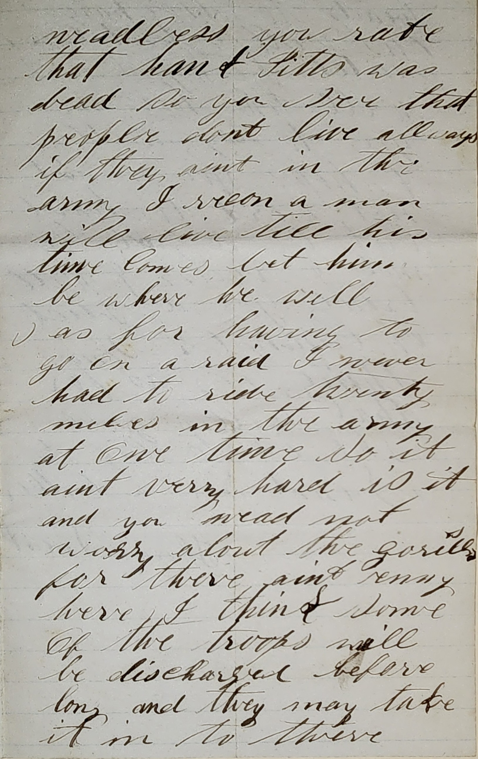 You wrote that Aunt Pitts was dead so you see that people don’t live always [even] if they ain’t in the army. I recon a man will live till his time comes, let him be where he will. As for having to go on a raid, I never had to ride twenty miles in the army at one time, so it ain’t very hard, is it? And you need not worry about the guerrillas for there ain’t any here.