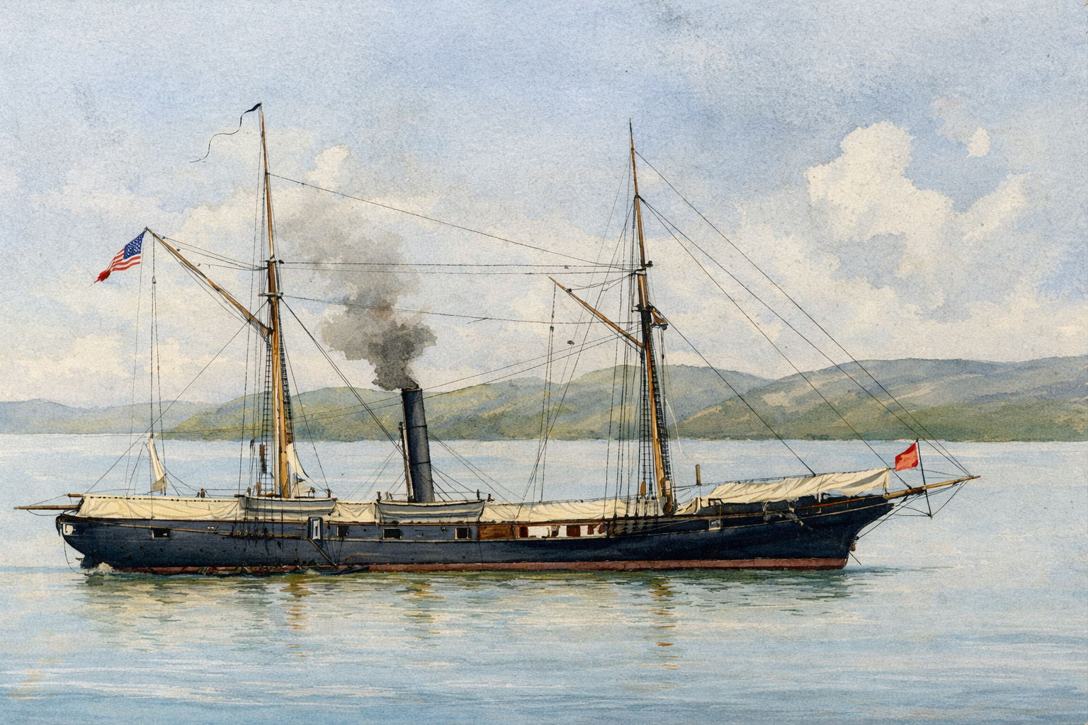 Colorized version of the USS Tahoma from sketch by R. G. Skerrett; she was a wooden-hulled, 4th rate screw gunboat, measuring 154 feet from stem to stern, constructed during 1861 at Wilmington, Delaware, by W. and A. Thatcher—was launched on 2 October 1861; and commissioned at the Philadelphia Navy Yard on 20 December 1861. She carried a crew of 100 men and was armed with a rifled muzzleloading 8-inch Parrot gun, two 24-pounder howitzers, and two 20-pounder Parrot rifled guns. At the time his letter was written, she was commanded by Alexander A. Semmes, a less famous cousin of Raphael Semmes.Source: Action on the Florida Coast.