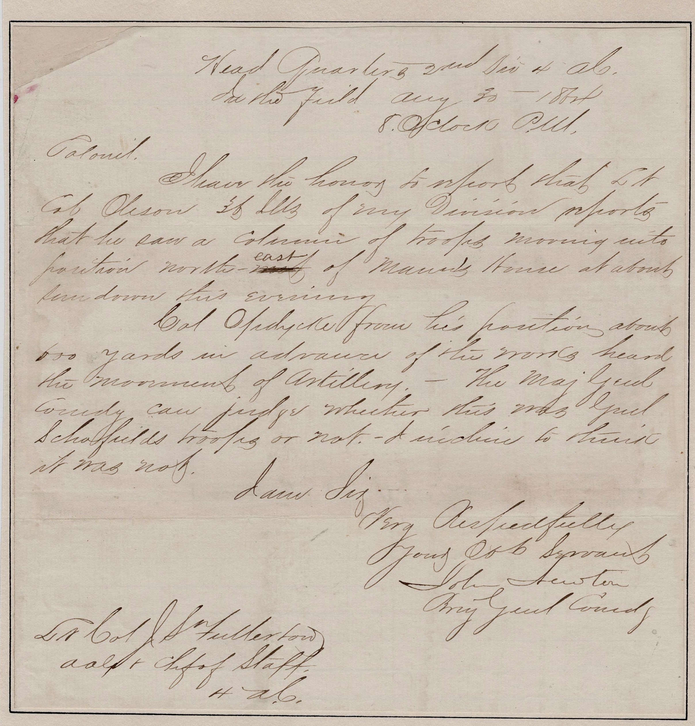 Newton composed the note to Lt. Col. Joseph Scott Fullerton (1835-1897), who held the position of Aide-de-Camp and Chief of Staff for Thomas’s IV Army Corps. The note was intended to inform Maj. Gen. Thomas of observed troop and artillery movements in the area and to inquire, essentially, whether they were allies or adversaries. Schofield’s maneuvers seemed to be unknown to Newton, who was in the process of preparing to disrupt the Macon & Western Railroad to the south of Atlanta, becoming involved in the Battle of Jonesborough from August 31 to September 1, 1864.