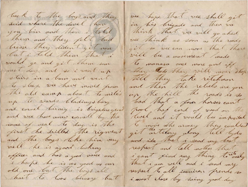 We have moved from the old camp about two miles up towards Bladensburg and Colonel Birney is Brigade General and we have a new Colonel by the name of [Thomas H.] Neill. Today is the first he drilled the regiment and the boys like him very well. He is a good looking officer and has a good voice and I hope he is as good as our old one but the boys all hate to lose Birney. But we hope that we shall get in his brigade and then we think that we will go ahead. We think as soon as the roads get so we can move that there will be a movement made to Manassas once more and if they do, they will never stop tIll they take Richmond and then the rebels are gone up the hill.