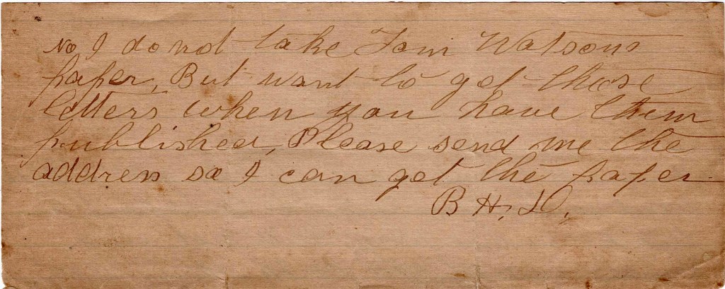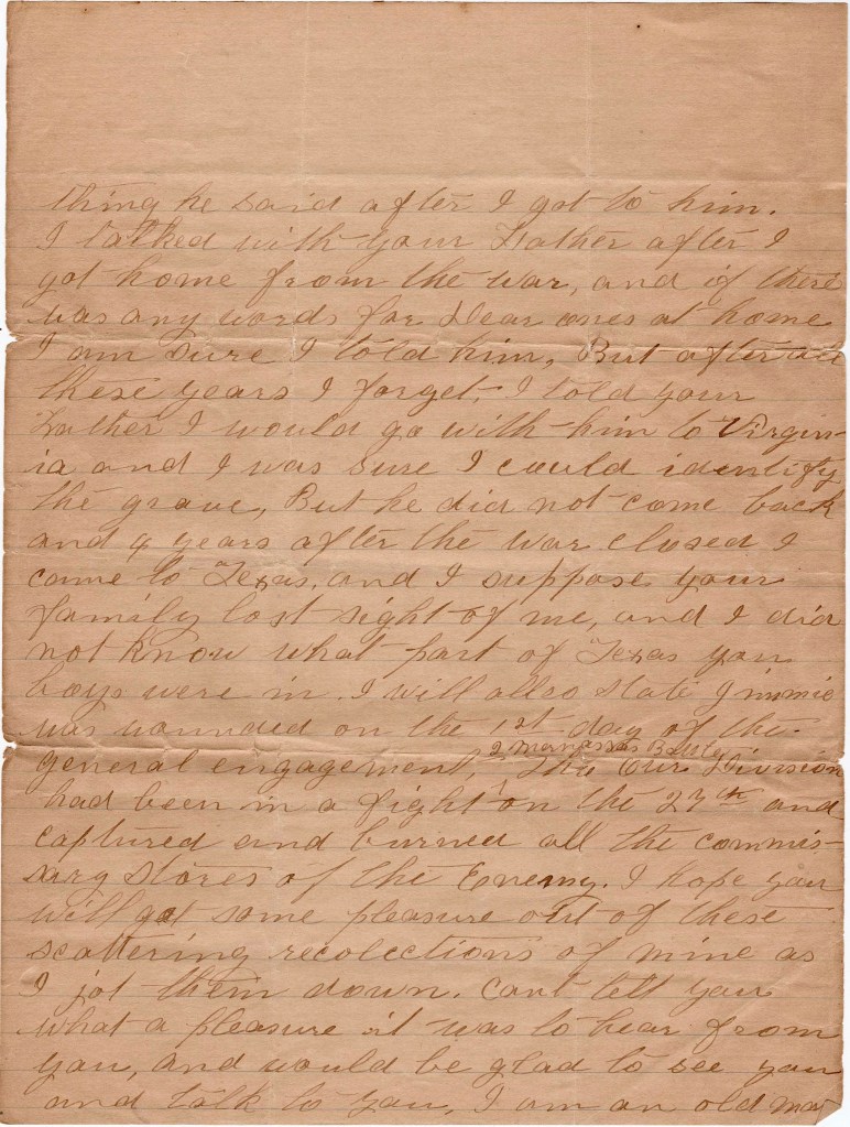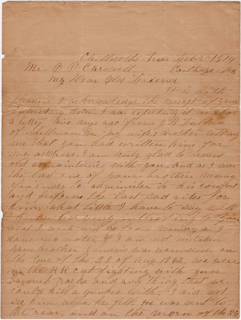These letters were written by W. M. Baker who seems to have been an older brother of the recipient, James F. Baker (1833-1890), a grocer in Panola, Texas, who lived in 1860 with his mother, Mary (Pittman) Baker (1793-1880) and sister Panthea Augusta Baker (1839-1872). In 1850, when James’ father Willis Perry Baker (1792-1856) was still living, the Bakers lived in Talbot county, Georgia. James’ older sister, Priscilla Gillean Baker (1826-1897) was married to Joseph Carswell in 1844 and they farmed in Buena Vista, Marion county, Georgia in 1860. Yet another brother, Allen Hill Baker (1823-1903) was married to Jane Augusta Roquemore (1827-1904) and they farmed in Carthage, Panola county, Texas, in 1860. My hunch is that these letters were first sent to his immediate family in Texas and then forwarded to his sister Priscilla in Georgia who kept them with her family papers.
