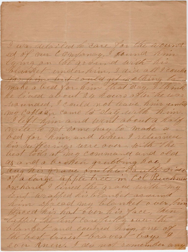 I sit down to let you know that me and Tom is well at present and hope that these few lines will find you in the same state of health. Our company was out on grand guard last night and it rained all day and all night but we had a good deal of fun, Me and the orderly Smith Dean from Abington went out to a farmers and took supper and we had some good buckwheat cakes and you had better believe they went good. Then we stayed and talked till 8 o’clock in the evening and then we went back to the boys and they said, “Where the devil have you been?” and then I told them and they felt bad because they didn’t get none. But I told them that I would go and get them some next day and so I went upstairs in a barn and went to sleep.
