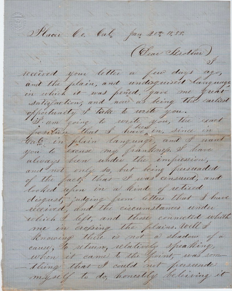 I am going to write you the exact position that I have been in since in California in plain language, and I want you to excuse my frankness. I have always been under the impression, and not only so, but being persuaded of the fact, that I was censured and looked upon in a kind of retired disgust, judging from letters that I have received, and the circumstances under which I left and those connected with me in crossing the plains. Well I knowing there is not a shadow of a cause, to return, relatively speaking, when it came to the point, was something that I could not persuade myself to do, honestly believing it better for all concerned, to remain where I am, particularly for Ma’s sake.