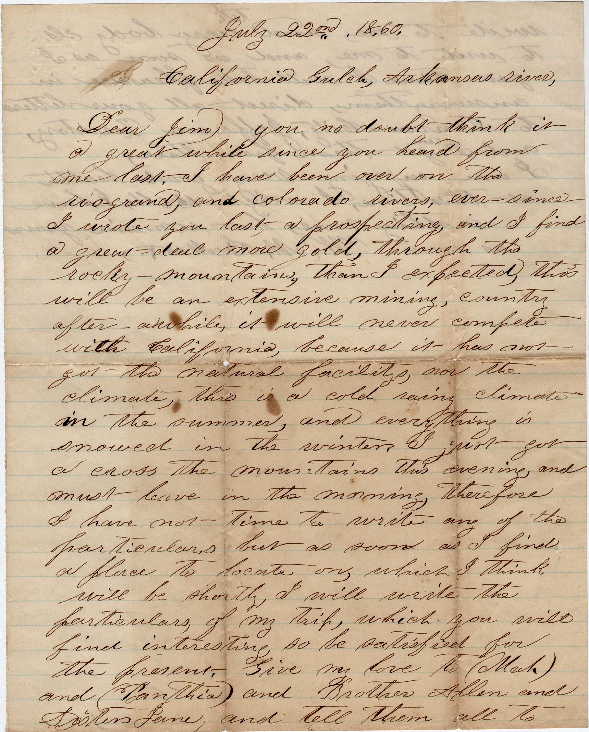 You no doubt think it a great while since you heard from me last. I have been over on the Rio Grande and Colorado rivers ever since I wrote you last, a prospecting, and I find a great deal more gold, through the Rocky Mountains than I expected. This will be an extensive mining country after a while. It will never compete with California because it has not got the natural facilities nor the climate. This is a cold, rainy climate in the summer and everything is snowed in the winter.
