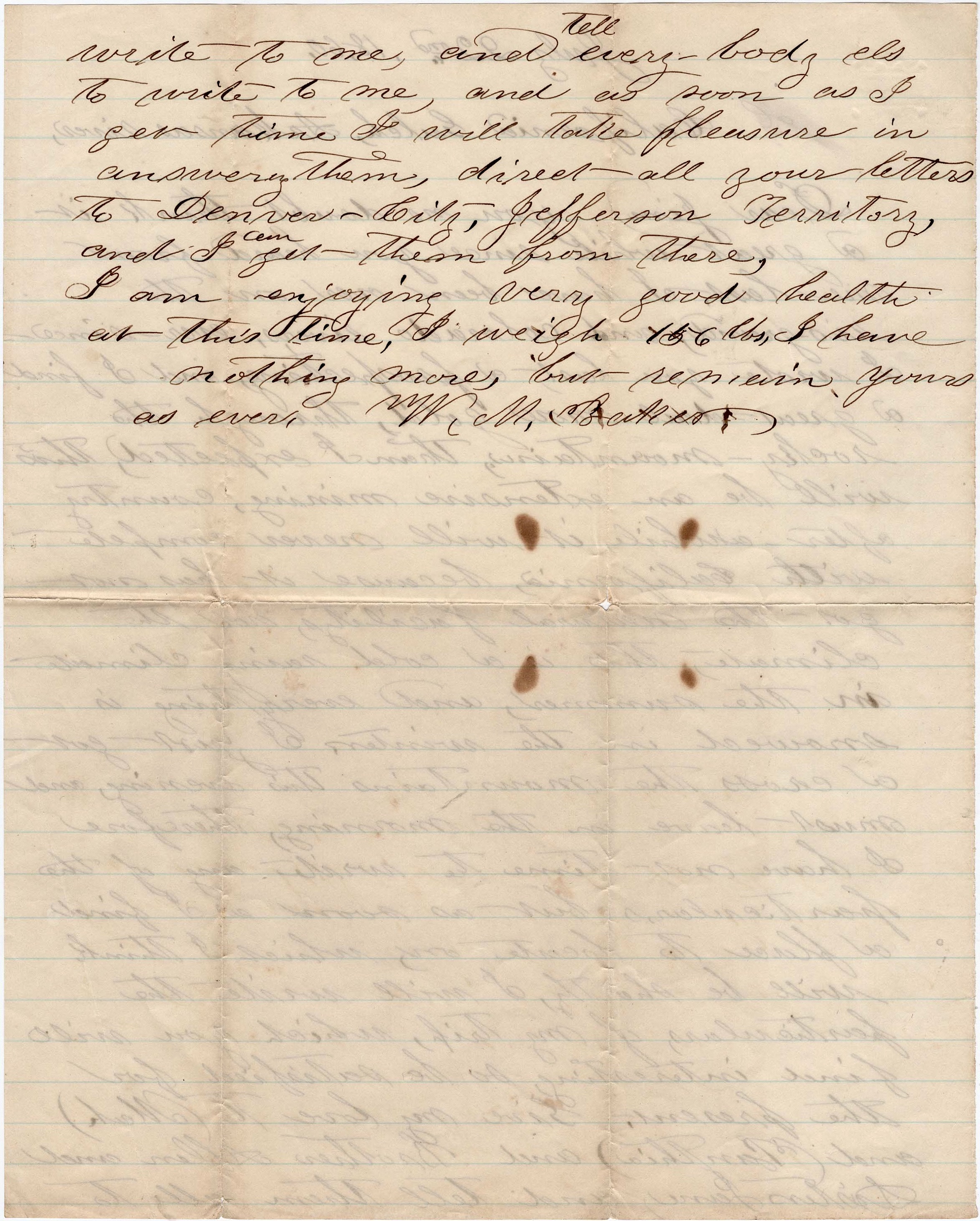 Give my love to Ma and Panthia and brother Allen and sister Jane and tell them all to write to me and tell everybody else to write to me. And as soon as I get time, I will take pleasure in answering them. Direct all your letter to Denver City, Jefferson Territory, and I can get them from there. I am enjoying very good health at this time. I weigh 156 pounds. I have nothing more but remain yours as ever. — W. M. Baker