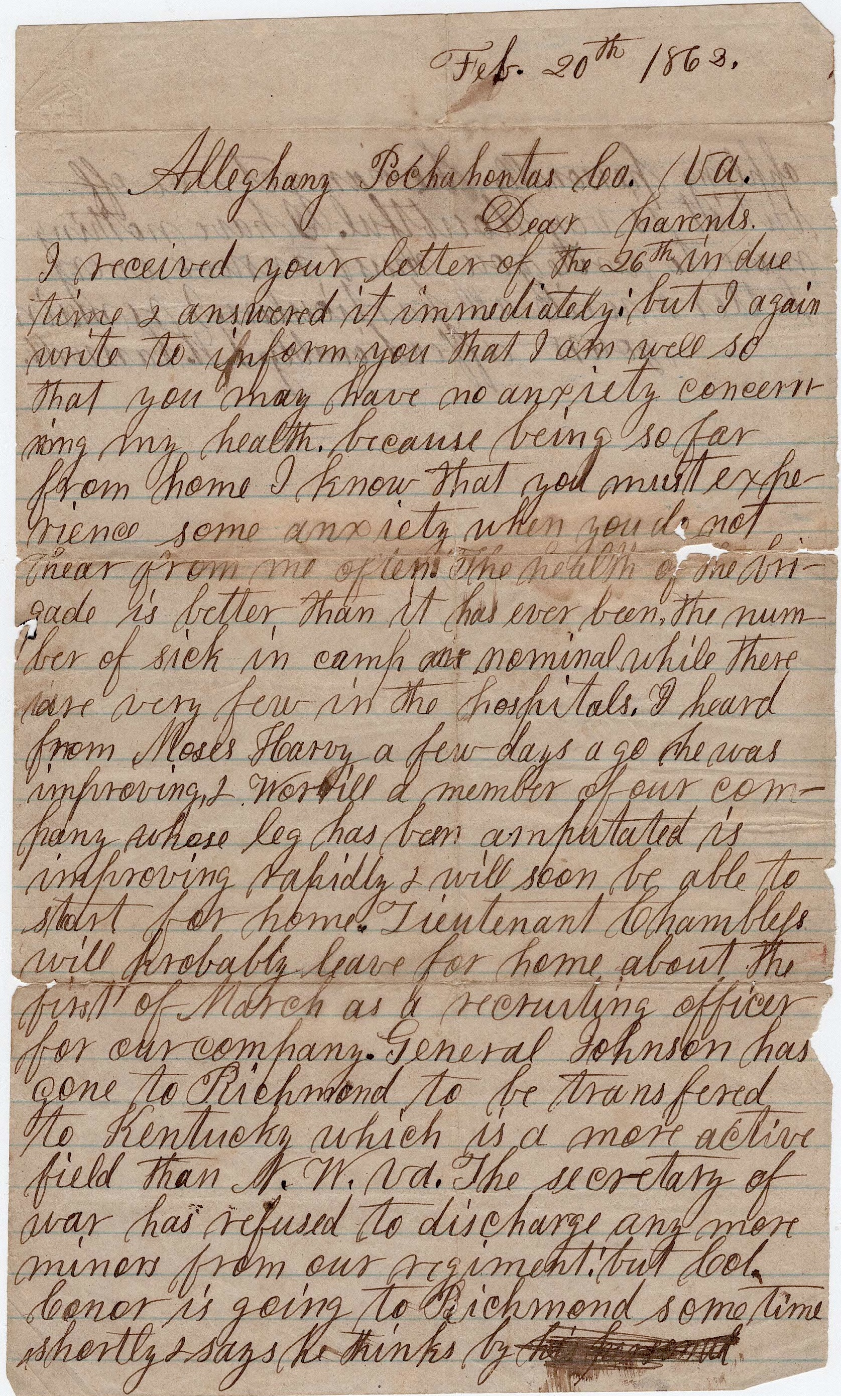 Alleghany, Pocahontas county, Va. February 20th 1862