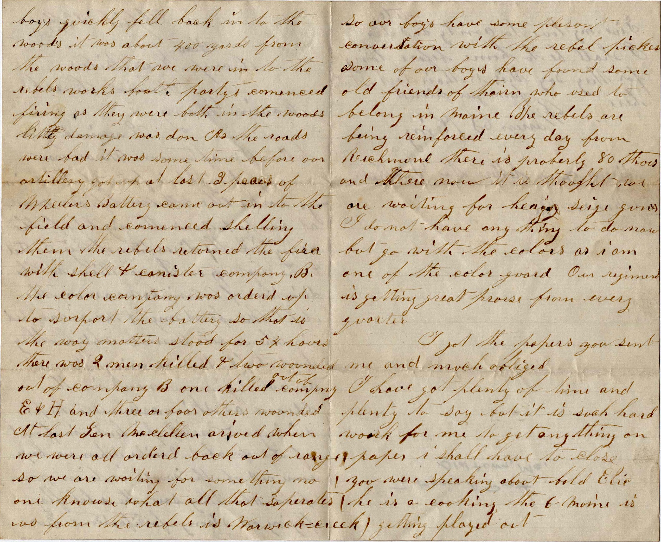 Today just before I began to write, a soldier got killed by a tree falling on him. He belongs to the 14th Massachusetts. He with some others was cutting down a tree. He started to run and the tree caught him.