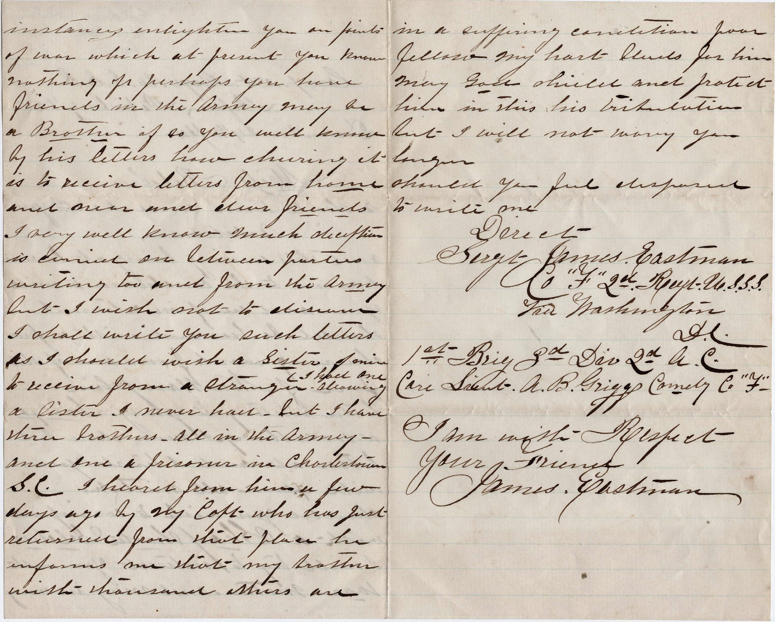 But I will not worry you longer. Should you feel disposed to write me, direct to Sergt. James Eastman, Co. F, 2nd Regt. USSS via Washington D. C.