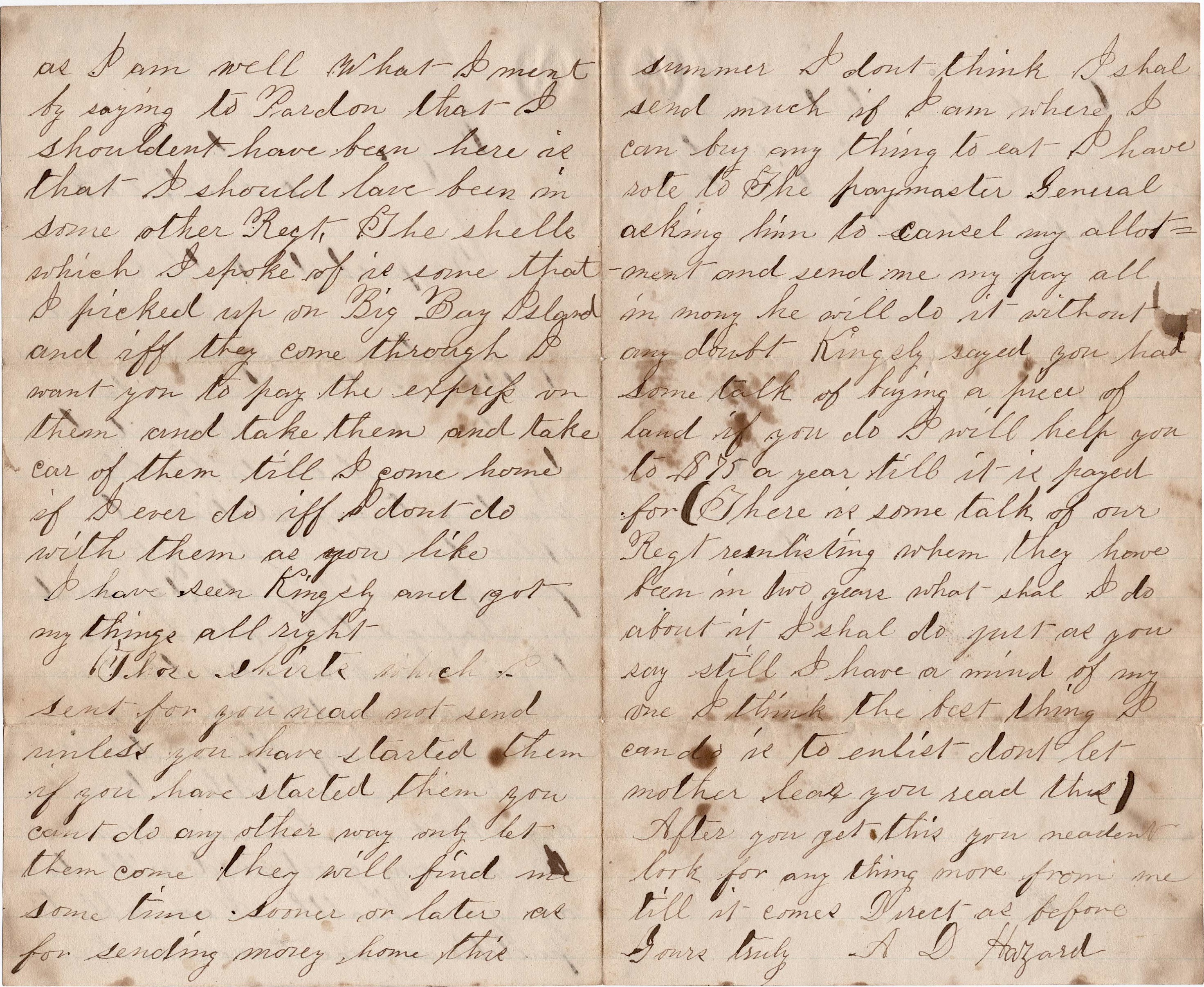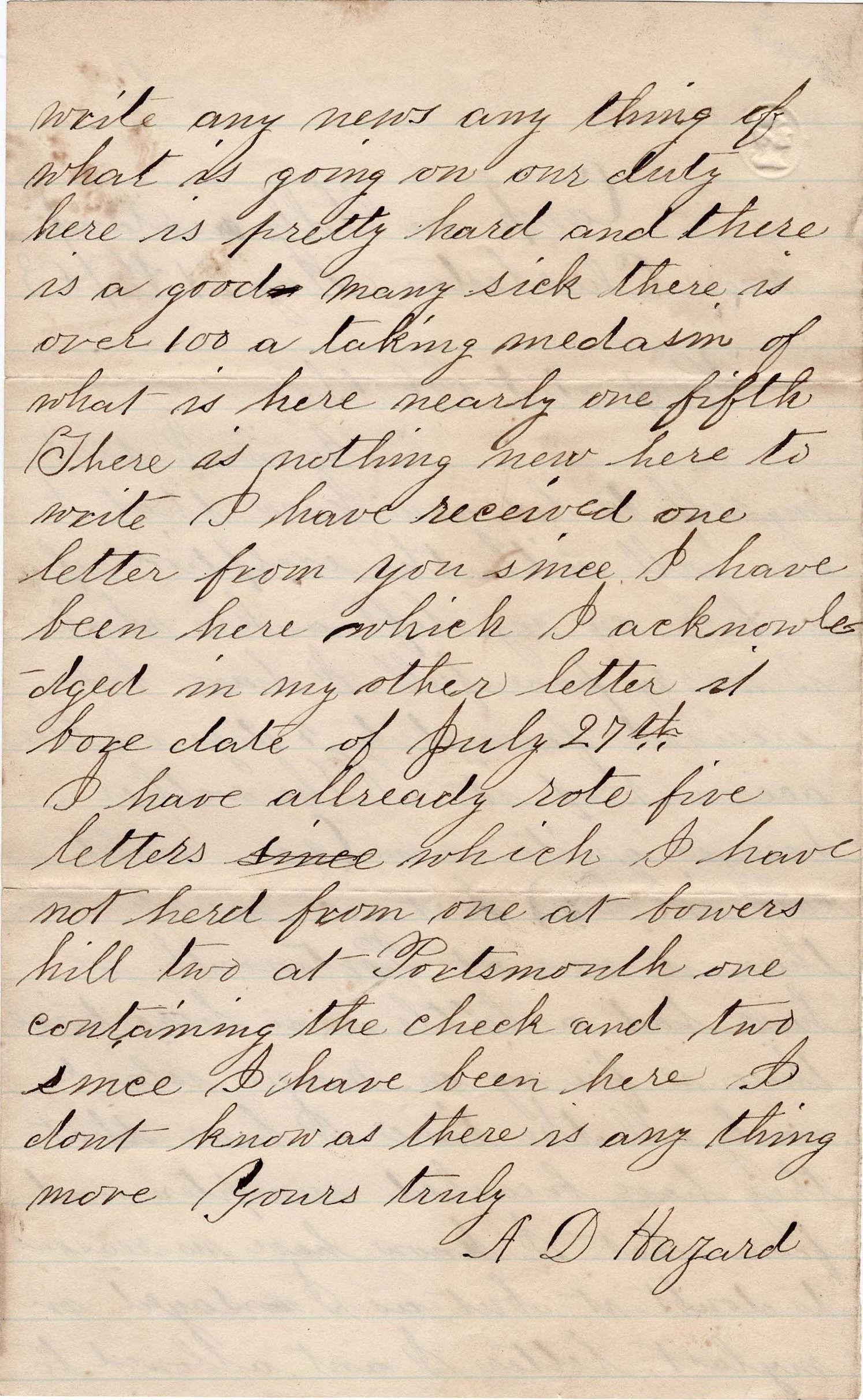 I have already wrote five letters which I have not heard from. One at Bower’s Hill, two at Portsmouth (one containing the check), and two since I have been here. I don’t know as there is anything more. Yours truly, — A. D. Hazard