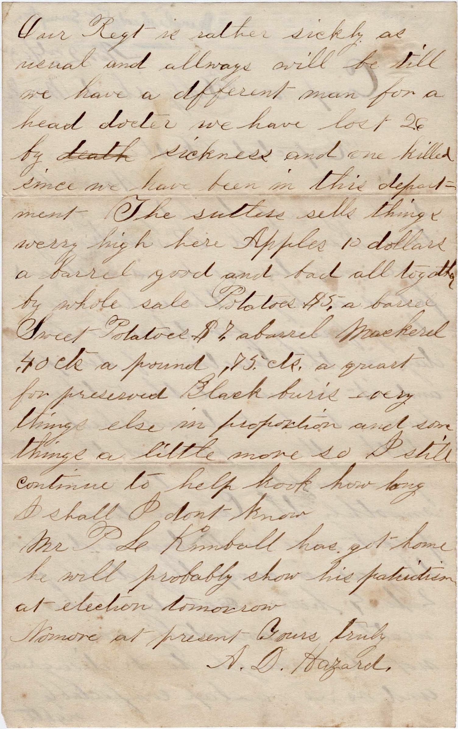 The sutler sells things very high here. Apples 10 dollars a barrel—good and bad altogether by whole sale. Potatoes are $5 a barrel. Sweet potatoes $7 a barrel. Mackerel 40 cents a pound, 75 cents a quart for preserved blackberries. Everything else in proportion and some things a little more so. I still continue to help cook. How long I shall, I don’t know.