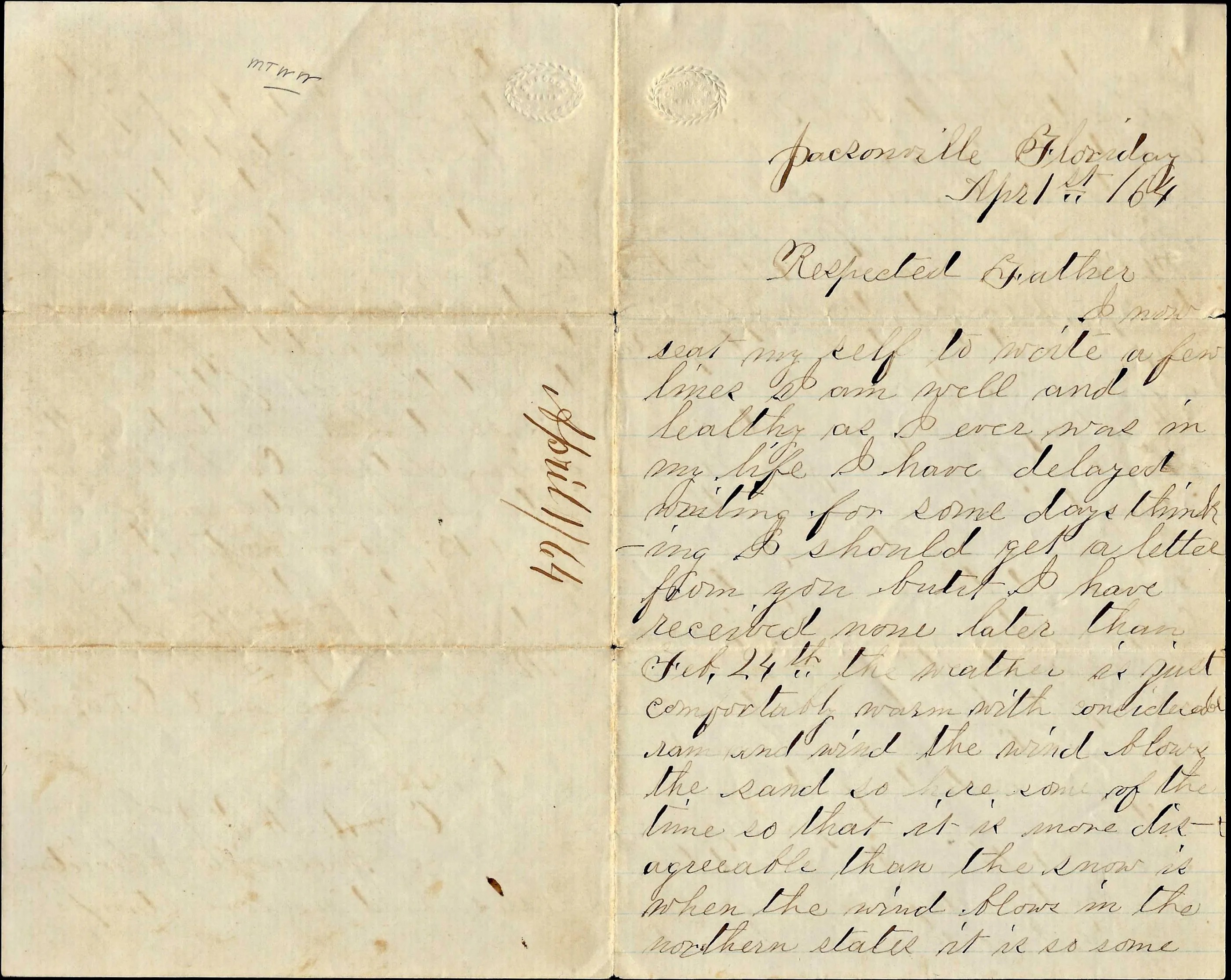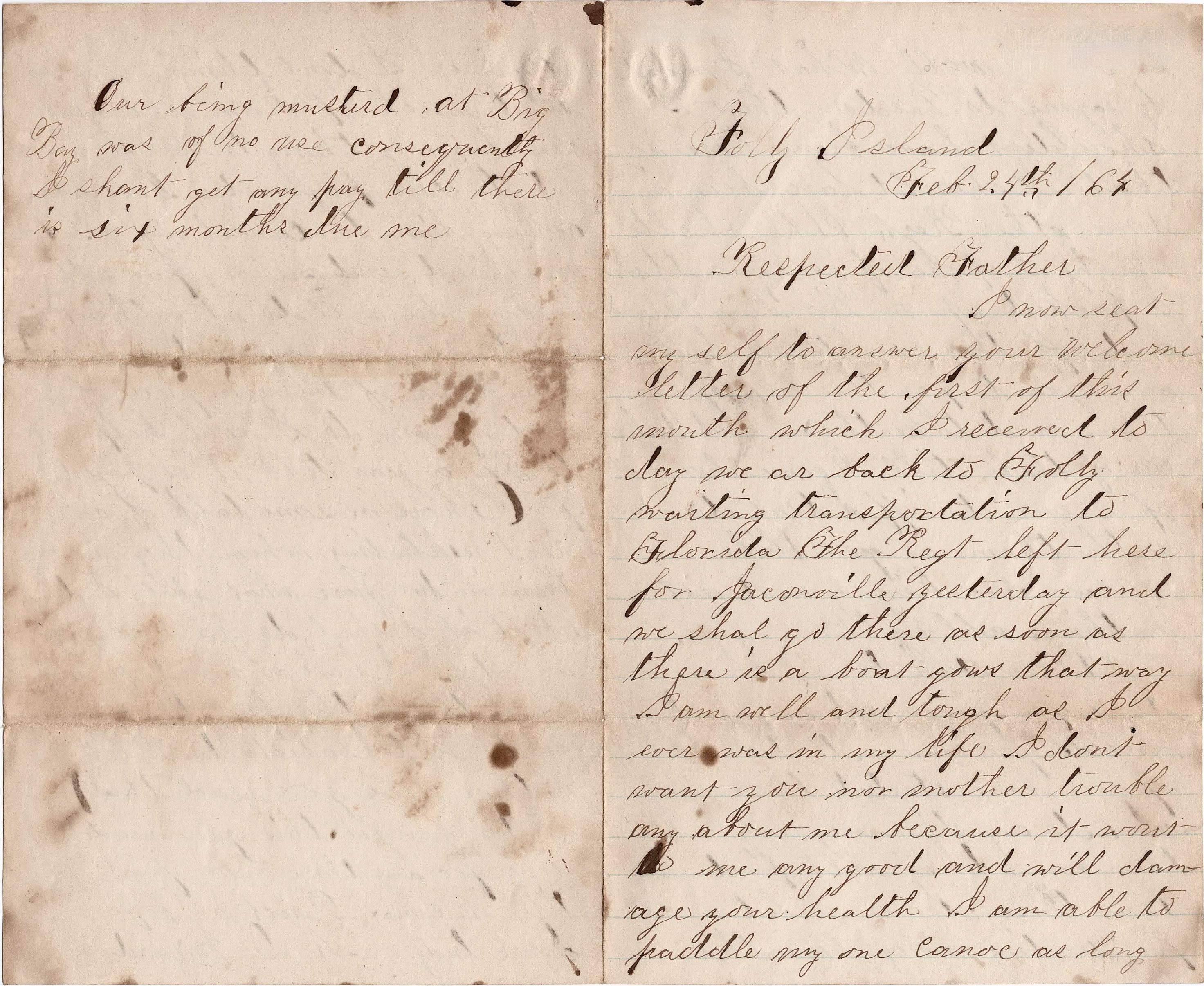 I now seat myself to answer your letter of the 1st of this month which I received today. We are back to Folly waiting transportation to Florida. The regiment left here for Jacksonville yesterday and we shall go there as soon as there is a boat goes that way. I am well and tough as I ever was in my life. I don’t want you nor mother to trouble any about me because it won’t do me any good and will damage your health. I am able to paddle my own canoe as long as I am well. What I meant by saying to pardon that I shouldn’t have been here is that I should have been in some other regiment.