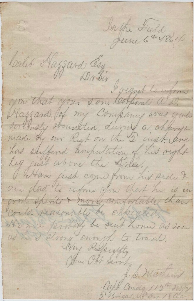 Dear sir, I regret to inform you that your son, Corporal A. D. Hazard of my company, was quite seriously wounded during a charge made by our regiment on the 2nd inst. and has suffered amputation of his right leg just above the knee.