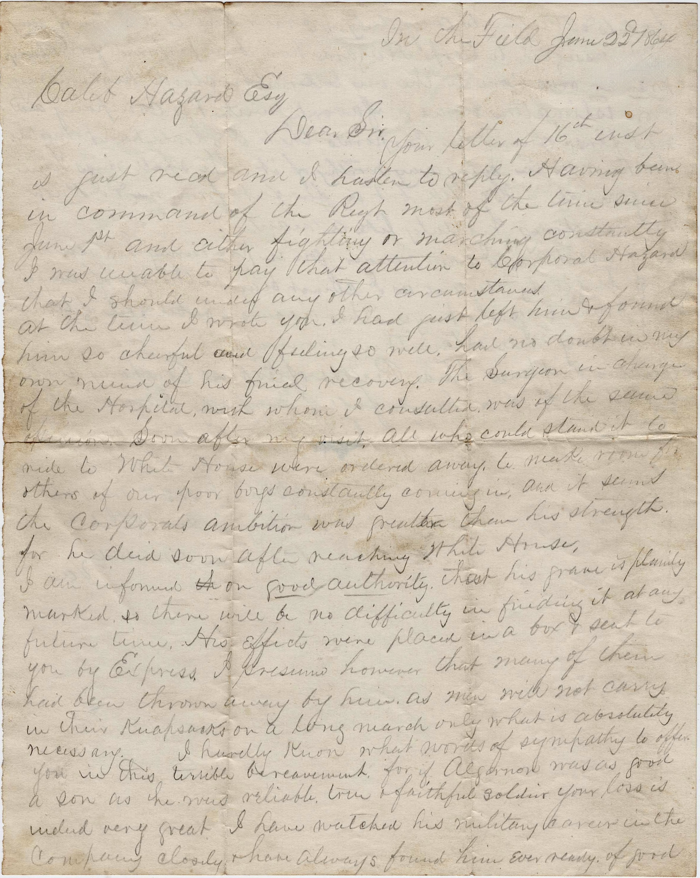 Dear sir, your letter of 16th inst. is just read and I hasten to reply. Having been in command of the regiment most of the time since June 1st and either fighting or marching constantly, I was unable to pay that attention to Corporal Hazard that I should under any other circumstances.