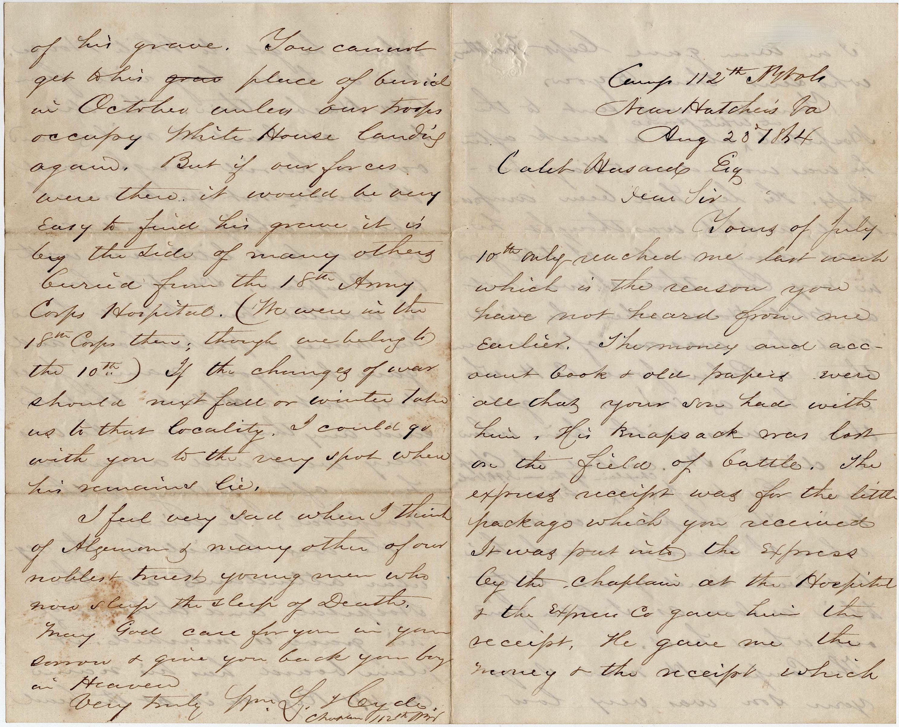 If the changes of war should next fall or winter take us to that locality, I could go with you to the very spot where his remains lie. I feel very sad when I think of Algernon and many others of our noblest, truest, young men who now sleep the sleep of Death. May God care for you in your sorrow and give you back your boy in Heaven. Very truly yours, — [William] L[yman] Hyde, Chaplain 112th N. Y.