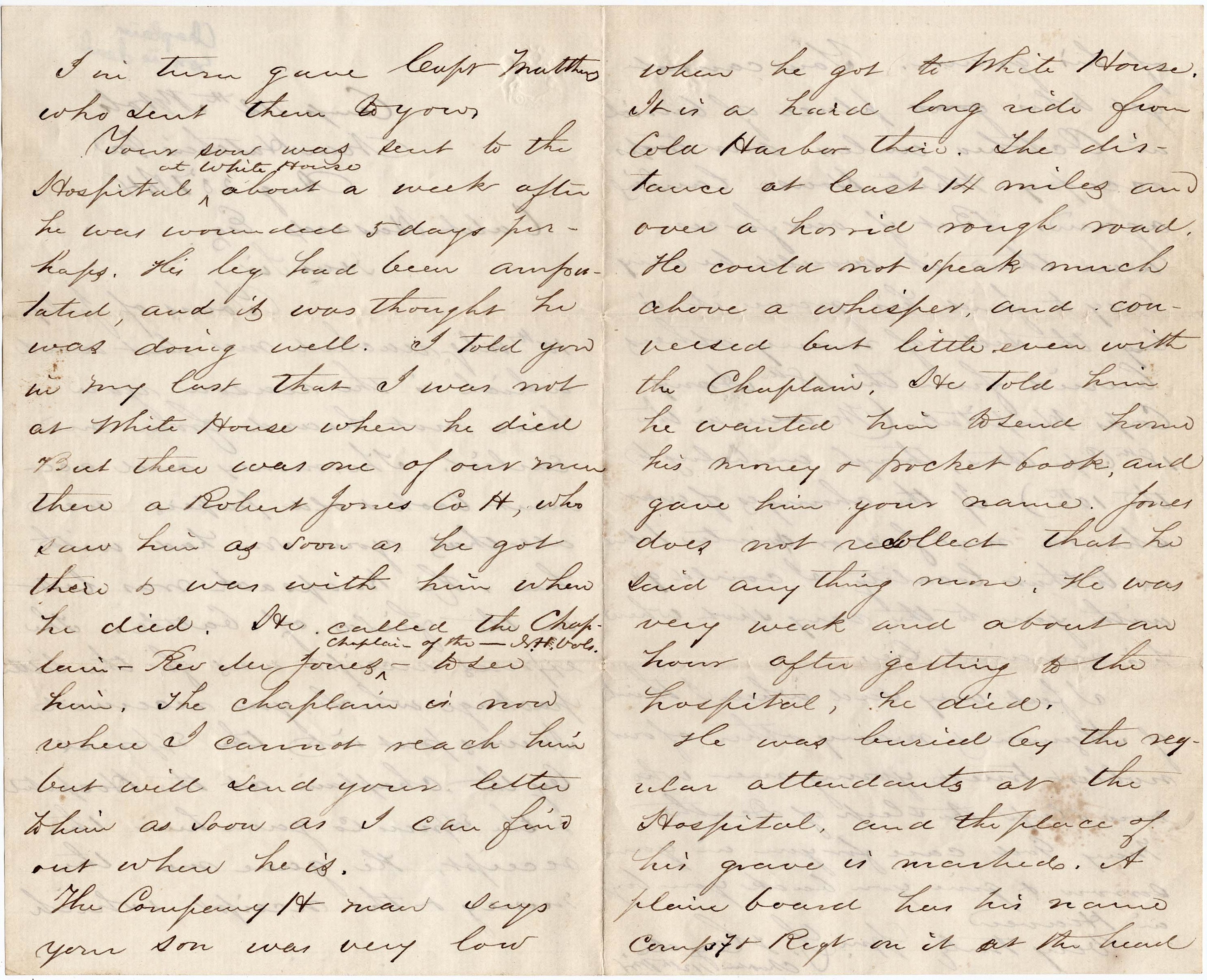 The Co. H man says your son was very low when he got to White House. It is a hard, long ride from Cold Harbor there—the distance at least 14 miles and over a horrid rough road. He could not speak much above a whisper, and conversed but little, even with the chaplain. He told him he wanted him to send home his money & pocket book and gave him your name. Jones does not recollect that he said anything more. He was very weak and about an hour after getting to the hospital, he died.