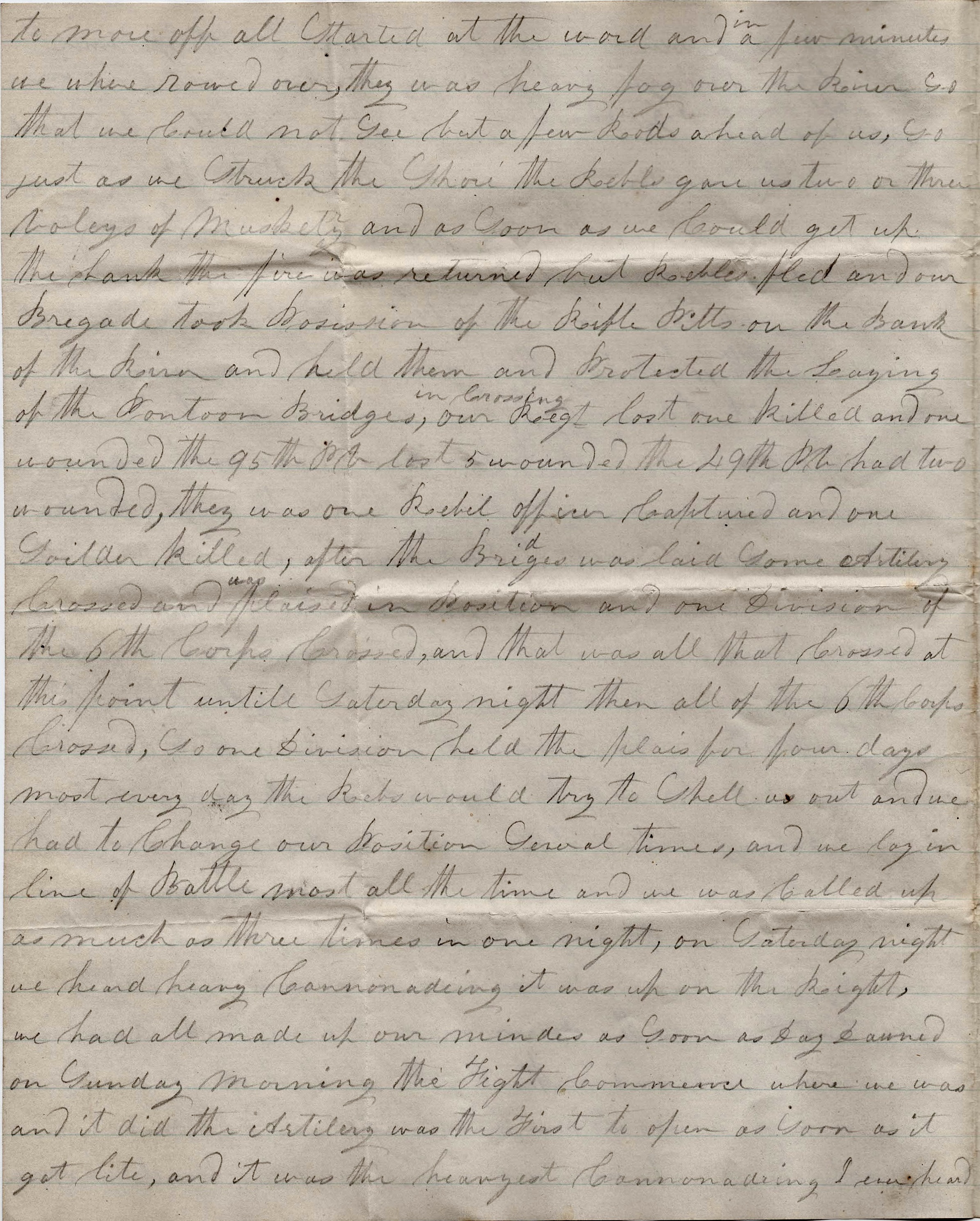 In crossing, our regiment lost one killed and one wounded. The 95th Penn. Vols. lost 5 wounded. The 49th Penn. Vols. had two wounded. They was one Rebel officer captured and one soldier killed.
