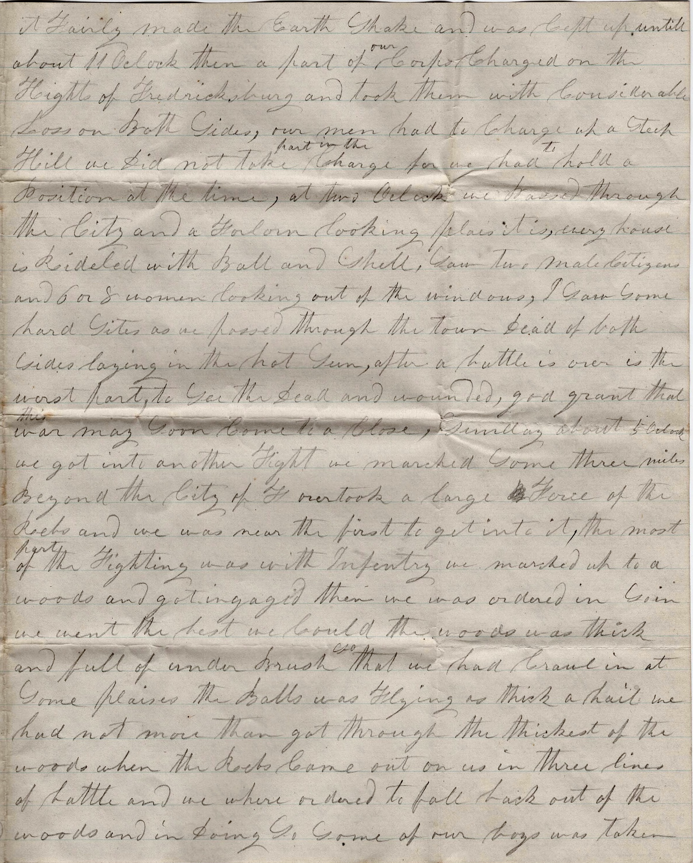 Sunday about 5 o’clock we got into another fight. We marched some three miles beyond the City of Fredericksburg [on the Orange Plank Road], overtook a large force of the Rebs and we was near the first to get into it. The most part of the fighting was with infantry. We marched up to a woods and got engaged; then we was ordered in. So in we went the best we could. The woods was thick and full of underbrush so that we had [to] crawl in at some places. The balls was flying as thick as hail. We had not more than got through the thickest of the woods when the Rebs came out on us in three lines of battle and we were ordered to fall back out of the woods and in doing so, some of our boys was taken prisoner and some killed and many wounded. I got out safe, but how I got through such hail of bullets safe, I can’t say except that God protected me though safe and I have felt so thankful for His protection over me. 2