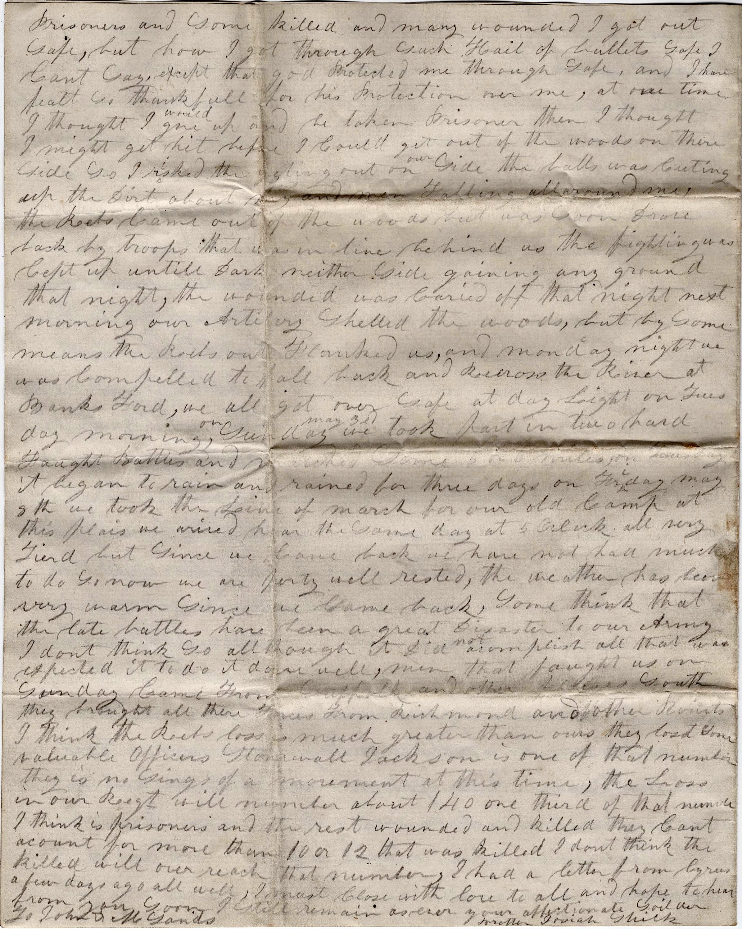 At one time I thought I would give up and be taken prisoner. Then I thought I might get hit before I could get out of the woods on their side so I risked the getting out on our side. The balls was cutting up the dirt about me and men falling all around me. The Rebs came out of the woods but was soon drove back by troops that was in line behind us. The fighting was kept up until dark, neither side gaining any ground that night. The wounded was carried off that night. Next morning our artillery shelled the woods but by some means the Rebs out-flanked us and Monday night we was compelled to fall back and recross the river at Banks Ford. We all got over safe at daylight on Tuesday morning. On Sunday, May 31st, we took part in two hard fought battles and marched some 5 or 6 miles.