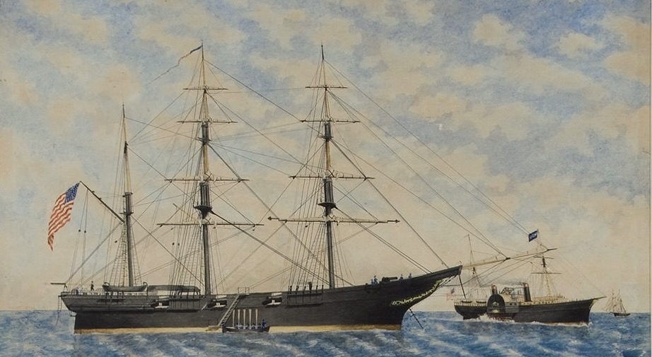 Watercolor of the Barque USS Pursuit by T. Flagler, c1863; the Federal troopship Empire City is alongside her.
