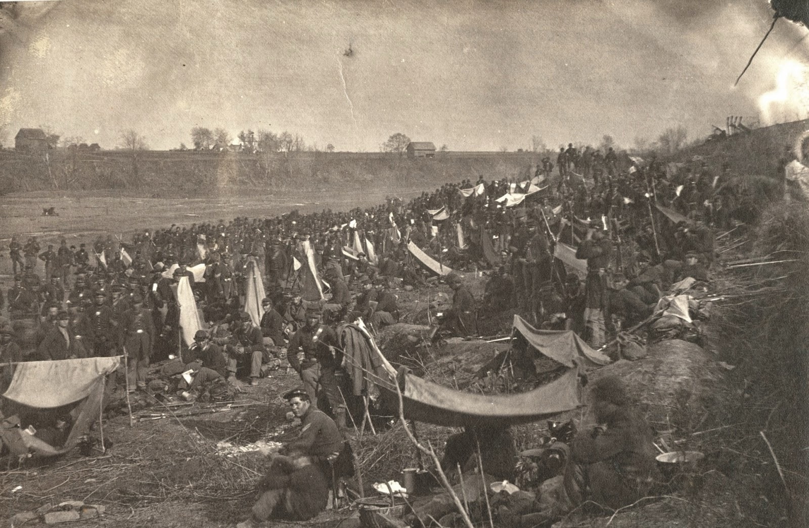 Brooks’s division photographed by Andrew J. Russell on the morning of May 3. Brooks’s men are near the pontoon crossing; the Rappahannock River is in the background near the houses on the horizon. Later in the day, some of these soldiers may have been killed or wounded at Salem Heights.
