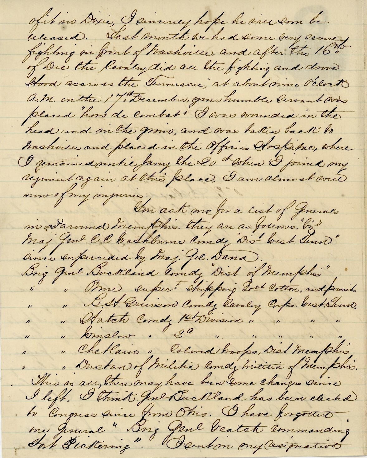 Last month we had some very severe fighting in front of Nashville and after the 16th of December, the cavalry did all the fighting and drove Hood across the Tennessee [river]. At about nine o’clock A.M. on the 17th of December, your humble servant was placed “hors de combat.” I was wounded in the head and in the groin, and was taken back to Nashville and placed in the officers Hospital where I remained until January the 20th when I joined my regiment again at this place. I am almost well now of my injuries.