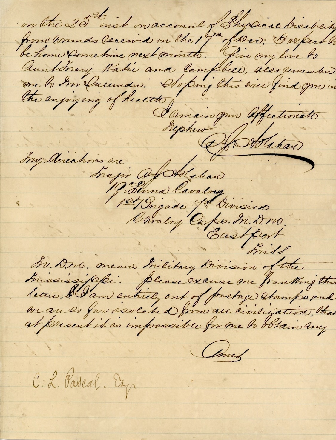 My directions are Major A. J. Holahan, 19th Penna. Cavalry, 1st Brigade, 7th Division, Cavalry Corps M. D. M., Eastport, Mississippi