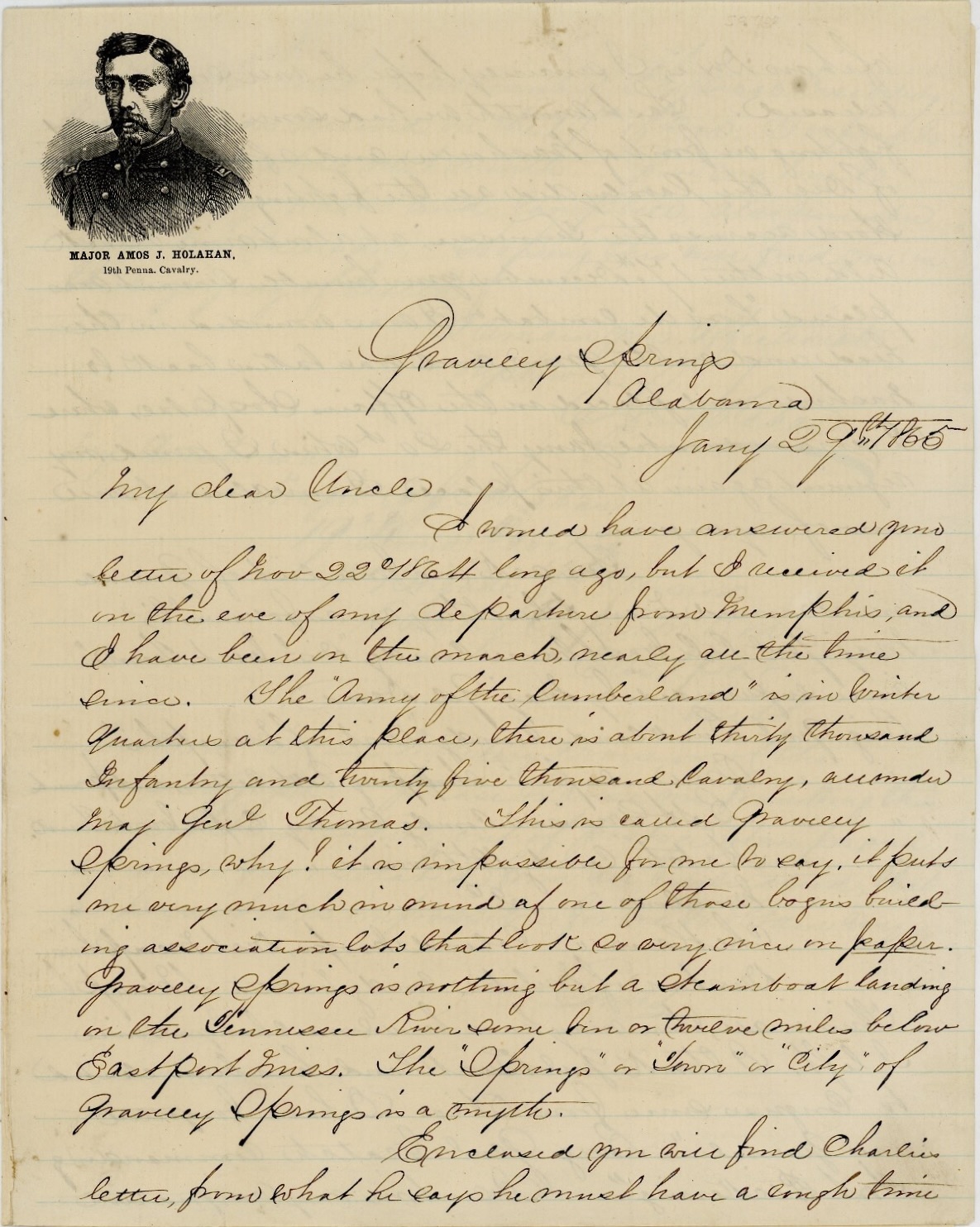 I would have answered your letter of November 22, 1864, long ago but I received it on the eve of my departure from Memphis, and I have been on the march nearly all the time since. The “Army of the Cumberland” is in winter quarters at this place. There is about thirty thousand infantry and twenty five thousand cavalry, all under Maj. Genl. Thomas. This is called Gravelly Springs, why? It is impossible for me to say. It puts me very much in mind of one of those bogus building association lots that look so very nice on paper. Gravelly Springs is nothing but a steamboat landing on the Tennessee River some ten or twelve miles below Eastport, Mississippi. The “Springs” or “Town” or “City” of Gravelly Springs is a myth.
