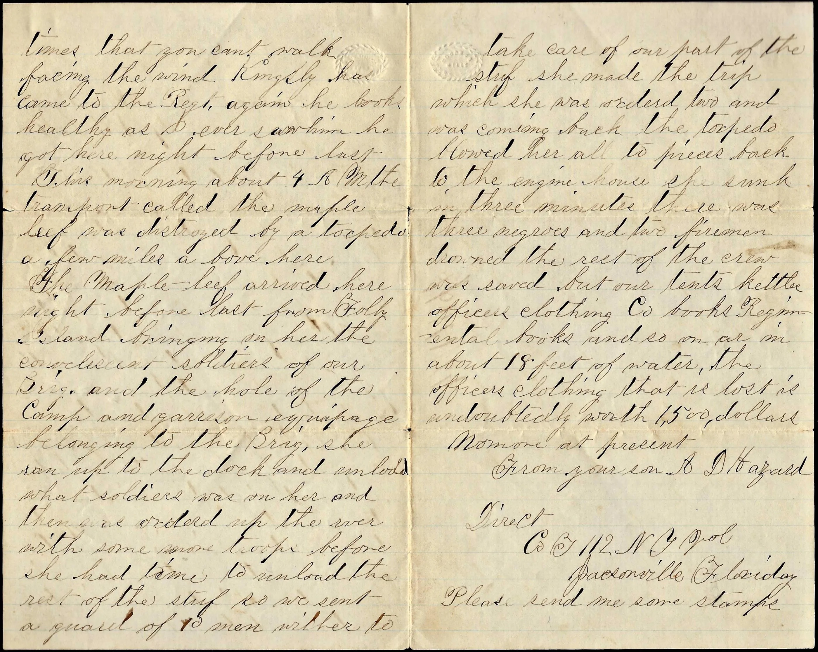 This morning about 4 A.M. the transport called the Maple Leaf was destroyed by a torpedo a few miles above here. The Maple Leaf arrived here night before last [31 March 1864] from Folly Island bringing on here the convalescent soldiers of our brigade and the whole of the camp and garrison equipage belonging to the brigade. She ran up to the dock and unloaded what soldiers was on her and then was ordered up the river with some more troops before she had time to unload the rest of the stuff, so we sent a guard of 10 men with her to take care of our part of the stuff. She made the trip [to Palatka] which she was ordered to and was coming back [when] the torpedo blowed her all to pieces back to the engine house. She sunk in three minutes. There was three negroes and two firemen drowned. The rest of the crew was saved but our tents, kettles, officer’s clothing, company books, regimental books, and so on are in about 18 feet of water. The officer’s clothing that is lost is undoubtedly worth 1,500 dollars.