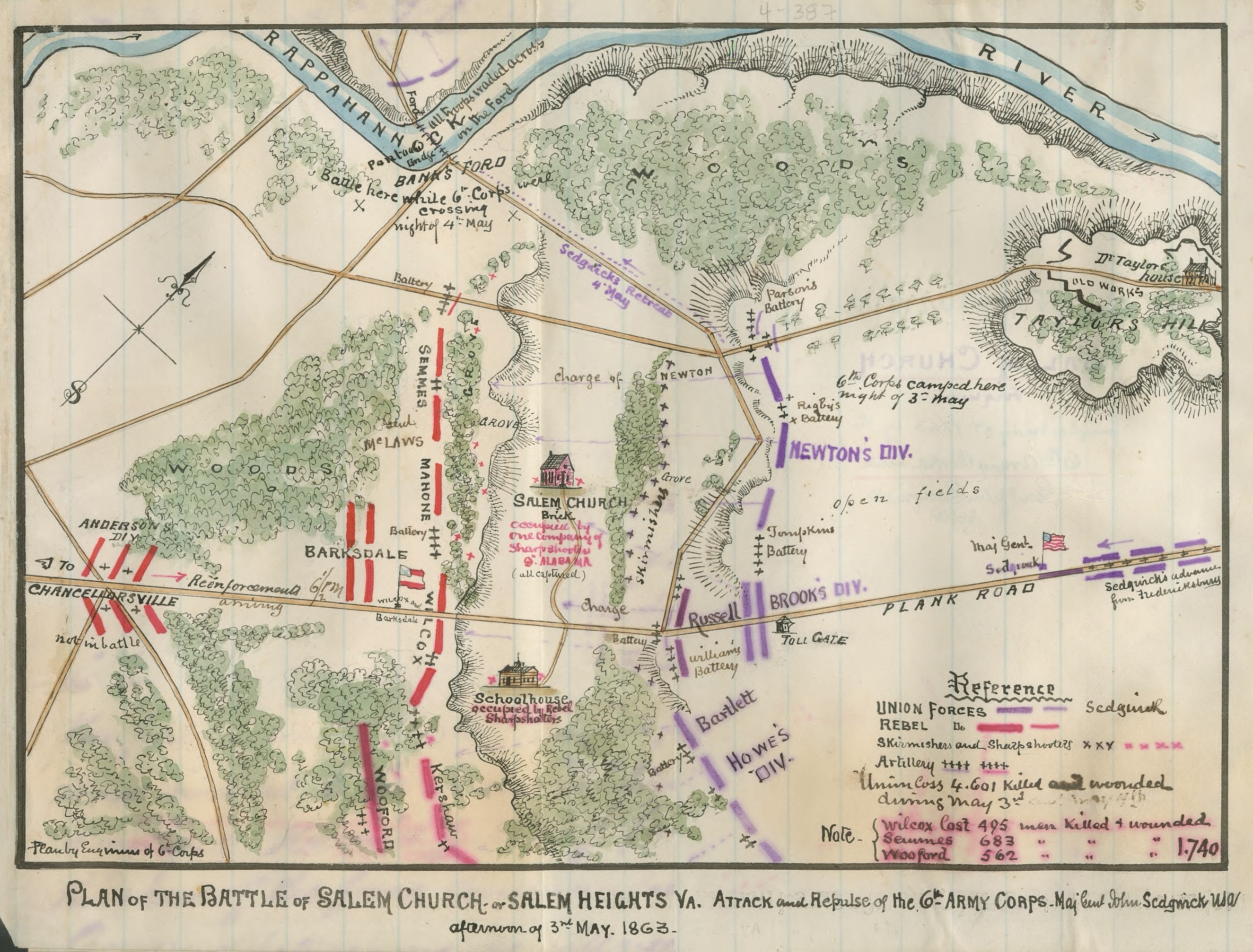 After the bridges was laid, some artillery [Battery D, 2nd US Artillery] crossed and was placed in position and one Division of the 6th Corps [Sedgwick’s] crossed and that was all that crossed at this point until Saturday night. Then all of the 6th Corps crossed, so one Division [Brooks’] held the place for four days. Most every day the Rebs would try to shell us out and we had to change our position several times and we lay in line of battle most all the time and we was called up as much as three times in one night.