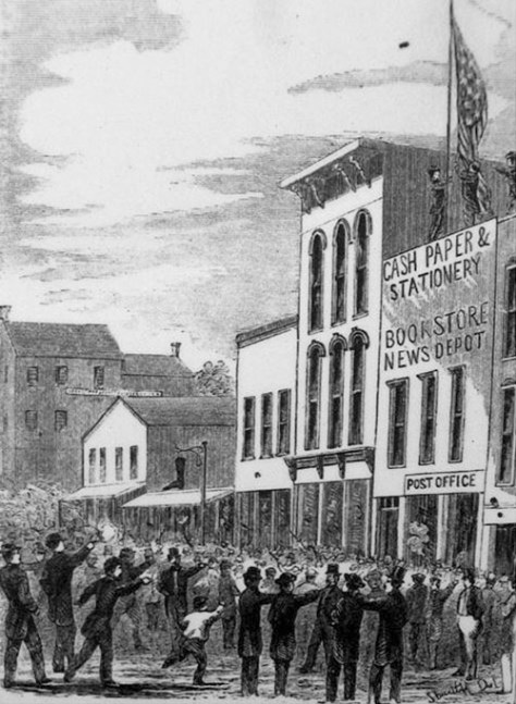 Early in the war, both pro-Southern and pro-Northern supporters in St. Joseph displayed banners and flags. When John L. Bittinger became St. Joseph’s postmaster on May 22, 1861, he raised the U.S. flag on the roof of the post office. During the raising of the flag, former St. Joseph Mayor M. Jeff Thompson led an unruly mob that displayed their Southern sympathies by tearing down the flag and flagpole. Thompson later described the incident, “I drew my knife and pistol, ascended the very ladder that they had used to the roof of the building, and amid cheers, groans, shouts and threats, I severed the halyard with my bowie…” The mob tore the flag into pieces and threw the flagpole into the Missouri River. The men then turned their sights on other U.S. flags in town. When they went to Turner Hall they found that Robert Bradshaw and other Union supporters had locked and were guarding the doors. A member of the mob, Alonzo Slayback, asked Bradshaw to lower the flag. He agreed but insisted on firing a salute to the flag. As Bradshaw appeared on the roof, the crowd threatened to shoot him. Slayback pulled his own gun and defended him. Bradshaw cheered the flag, fired six shots in salute, and safely lowered the flag. The City Council banned flying flags of any kind in St. Joseph until after Union troops occupied the city. [Courtesy St. Joseph Museums, Inc.]