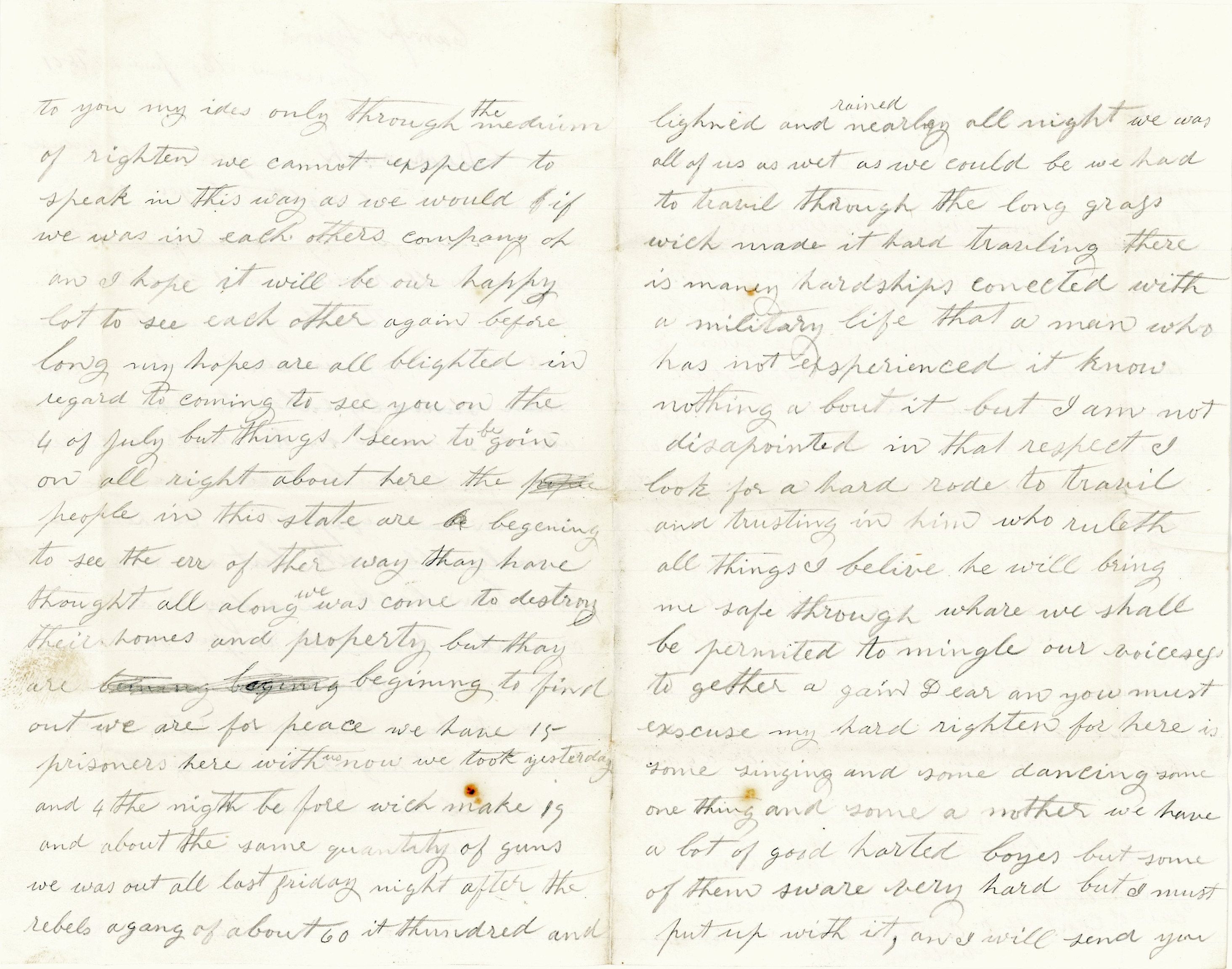 I now take the opportunity to write you a few lines for your meditation as I promised you. I would write to you the first opportunity that offered itself to me. I had a very wet time going home. It commenced to rain just as I came on the prairie by Major Young’s house so I went to Tom Woods’ house and ate supper with them thinking it would astop raining but my hopes was all blighted for just after I started, it commenced to rain [even] faster. But I did not get wet as I had on a good overcoat.