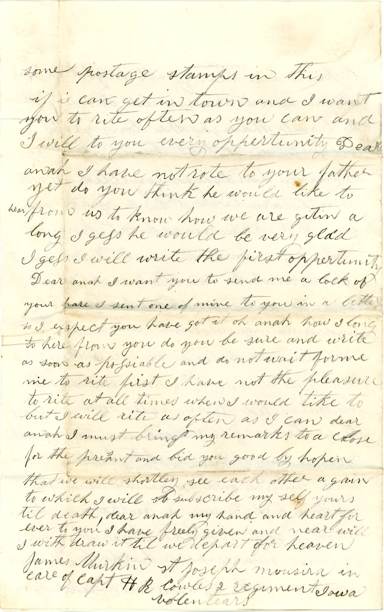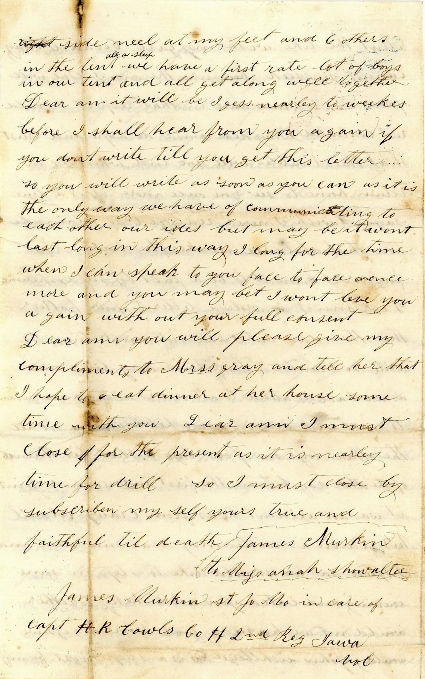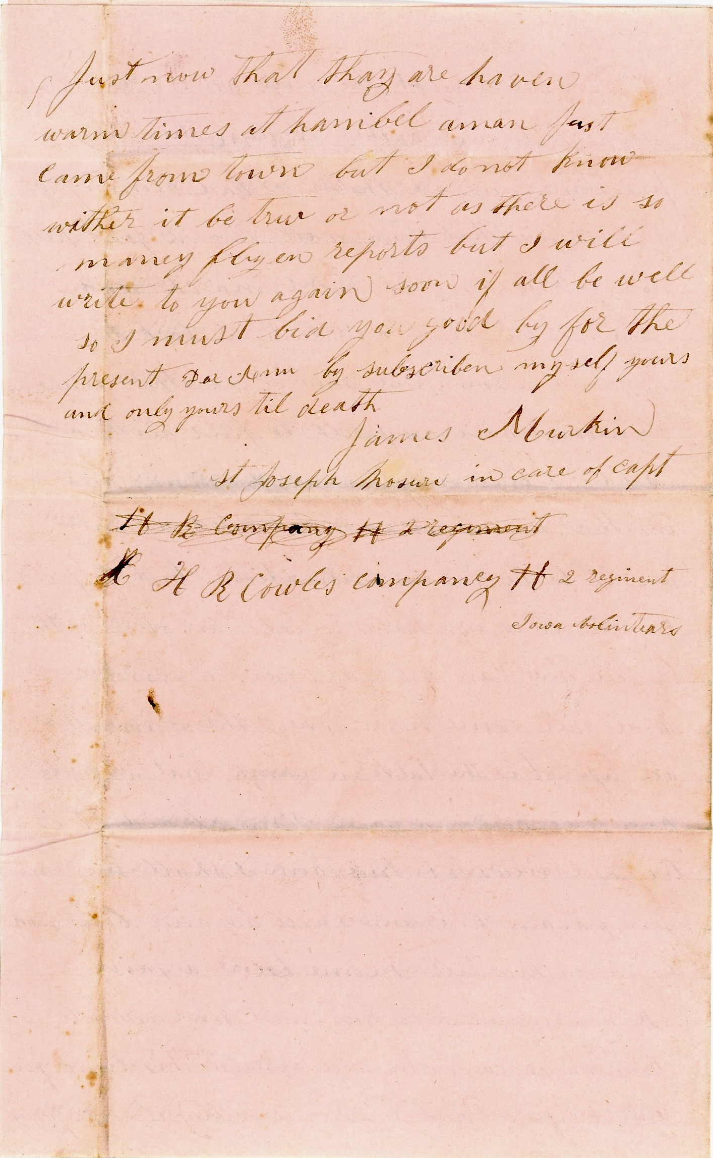 My address is James Murkin, Keokuk, Iowa, in care of Capt. H[enry] R. Cowles, 2nd Regiment Iowa Volunteers