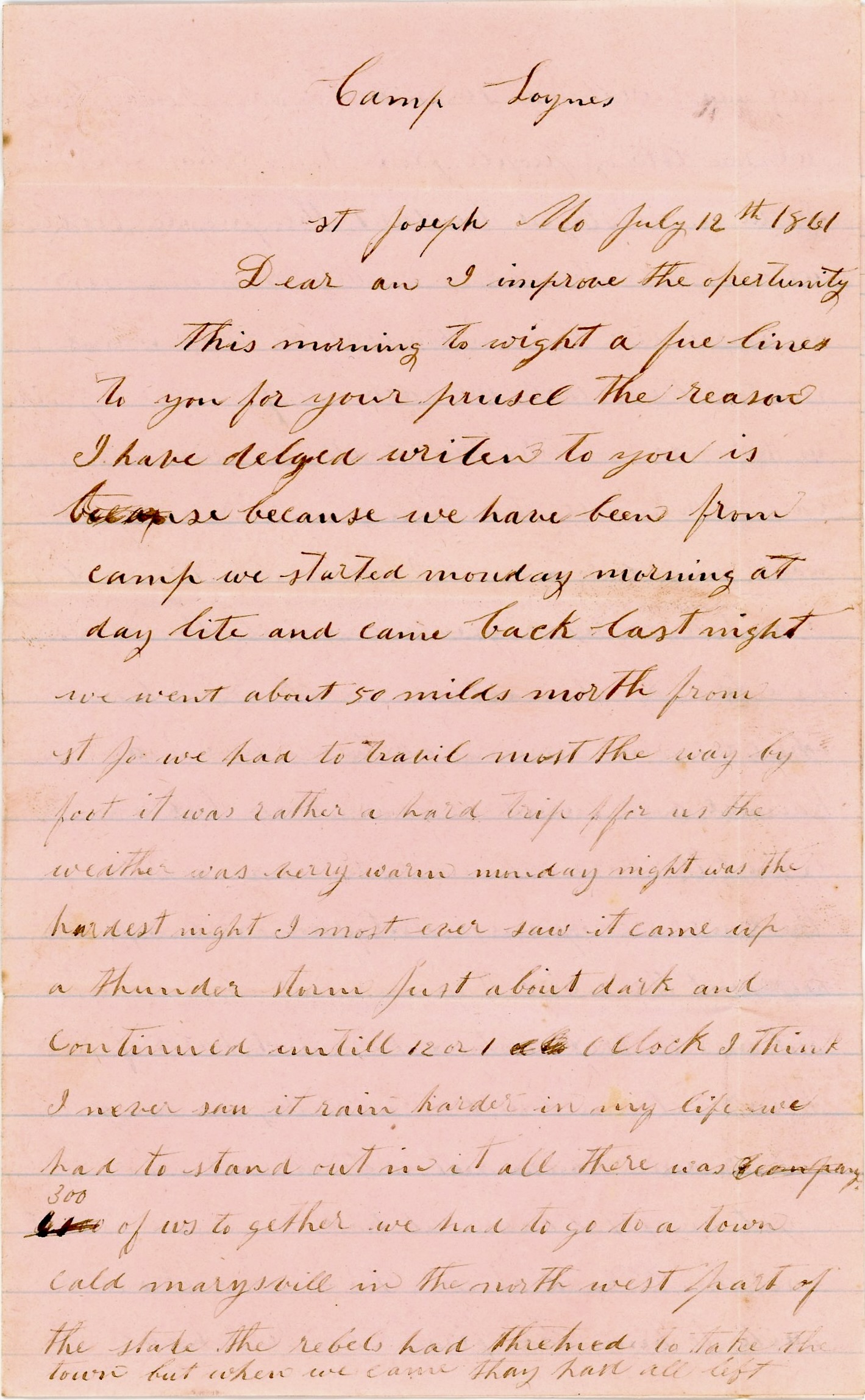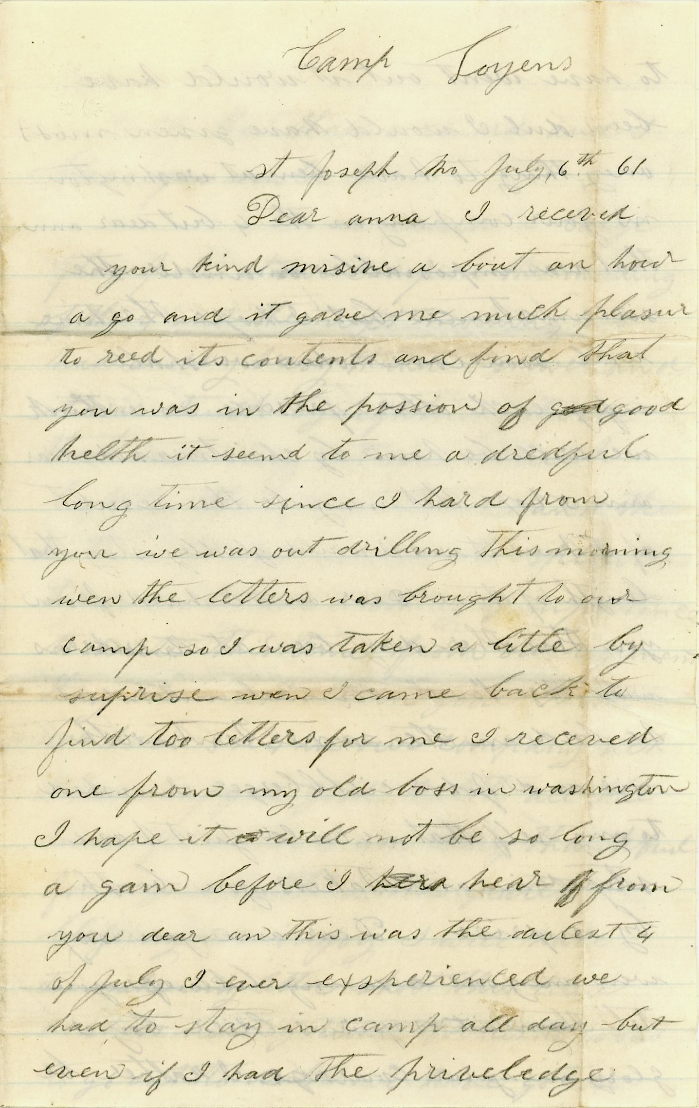 There is a great many rebels about here but they dare not say much as the Union men are the strongest. They have threatened the Union men of St. Joseph before we came but they are pretty quiet now. The people are pleased to see us wherever we go. If you had seen them come from town this morning when we fetched the rebels to town, one would think we had plenty friends.