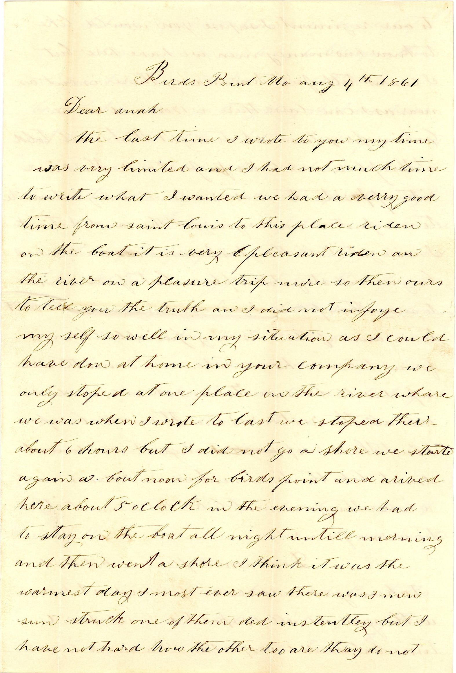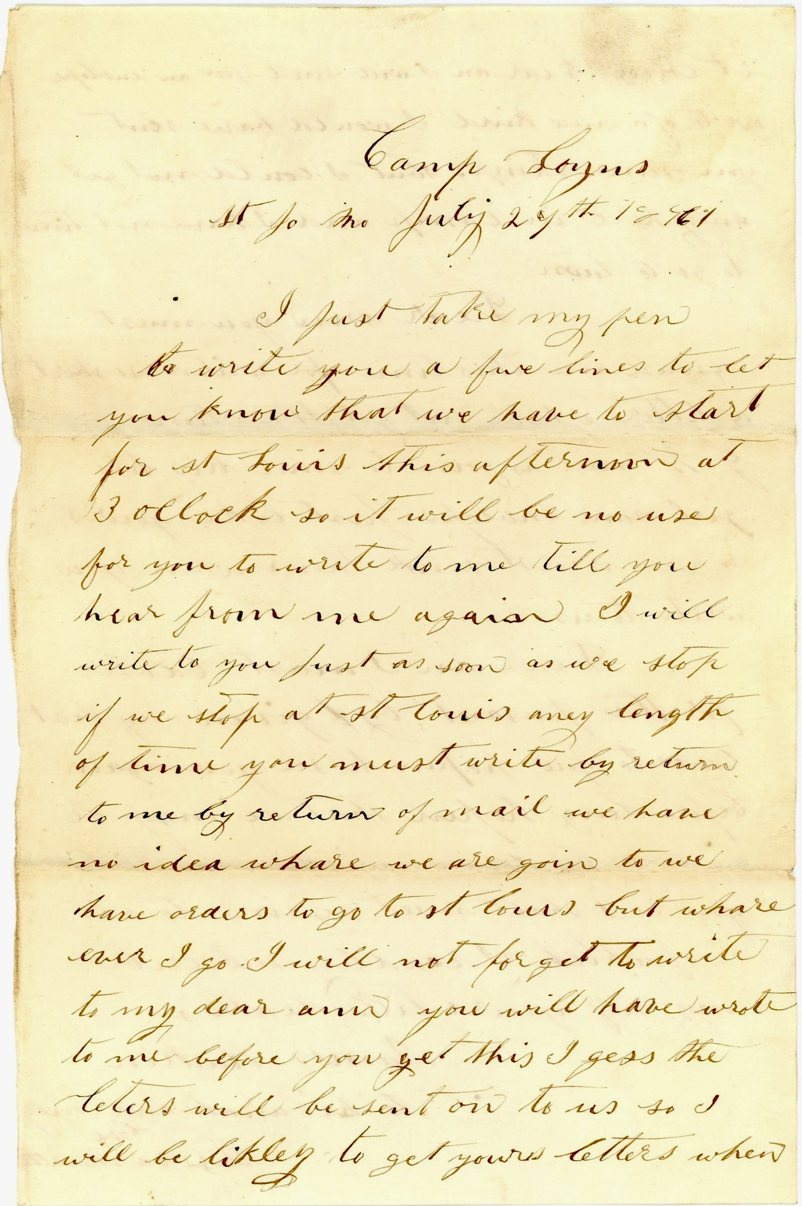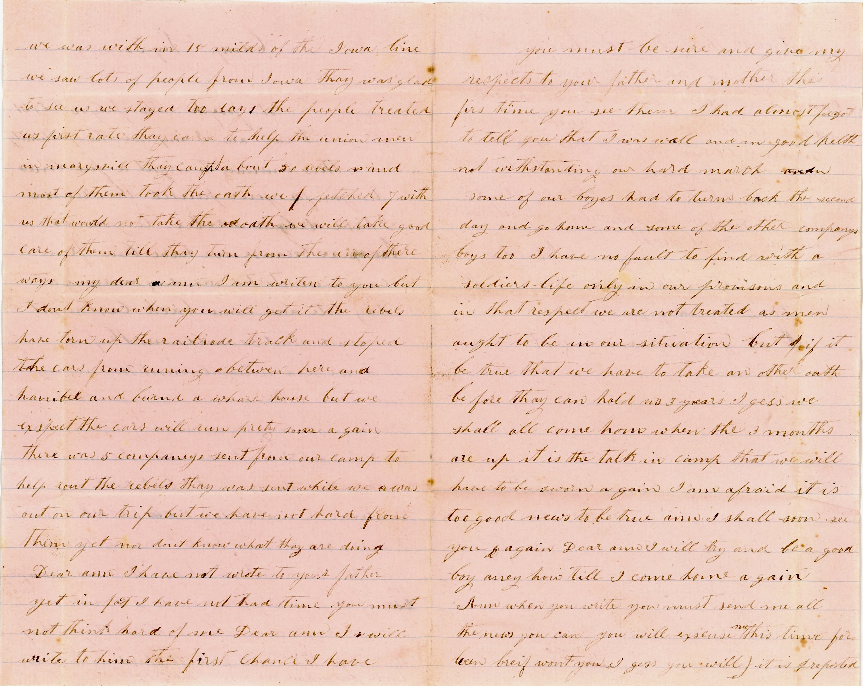 We arrived here all safe. There is 2,000 soldiers her now in Keokuk. It is the talk today that the 1st [Iowa] Regiment will leave for Cairo this week. We are living in town. We are not camped out yet. Ann, I cannot send you much news this time but hope I shall be able to write more next time. When you write to me again, I want you to send me your father’s given name. I want to write to him because I feel it my duty. He has treated me more like a father would a son. In fact, he has treated me better than I have deserved at his hands.