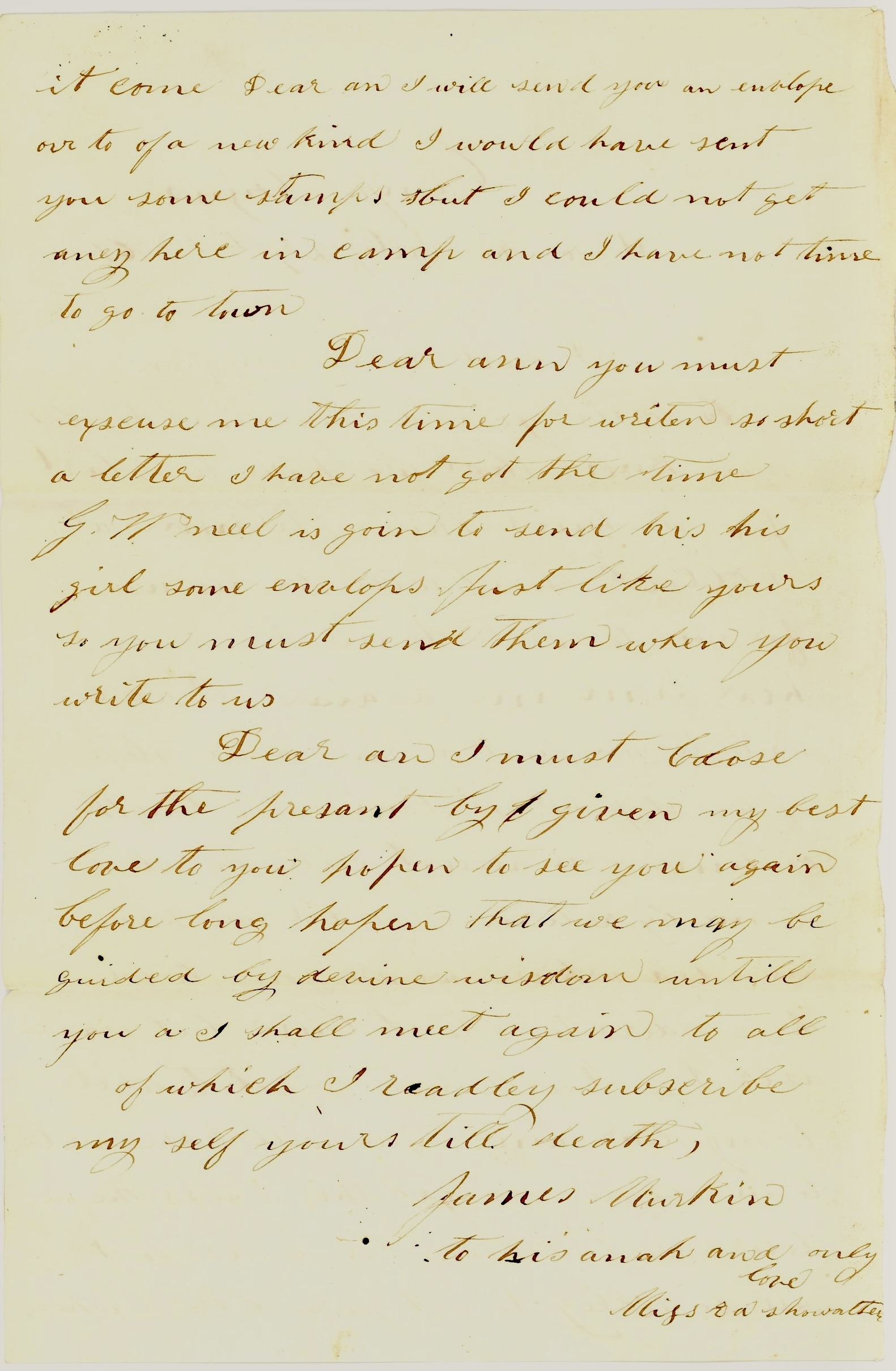 Ann, I do hope these few remarks I have made will not hurt your feelings. Ann, I shall surely come and see you soon as I can. Now Ann, I want you to comply with my request. Burn this [letter] if you please. I hope you will make out to read it. I have a very bad pen which you can readily see. I have considerable more to say but not at present as it is late. Ann, be sure and write a few lines as soon as you can as I am not sure what day I can come to see you. It will not do any harm to write to each other. Yours in love, — J. Murkin