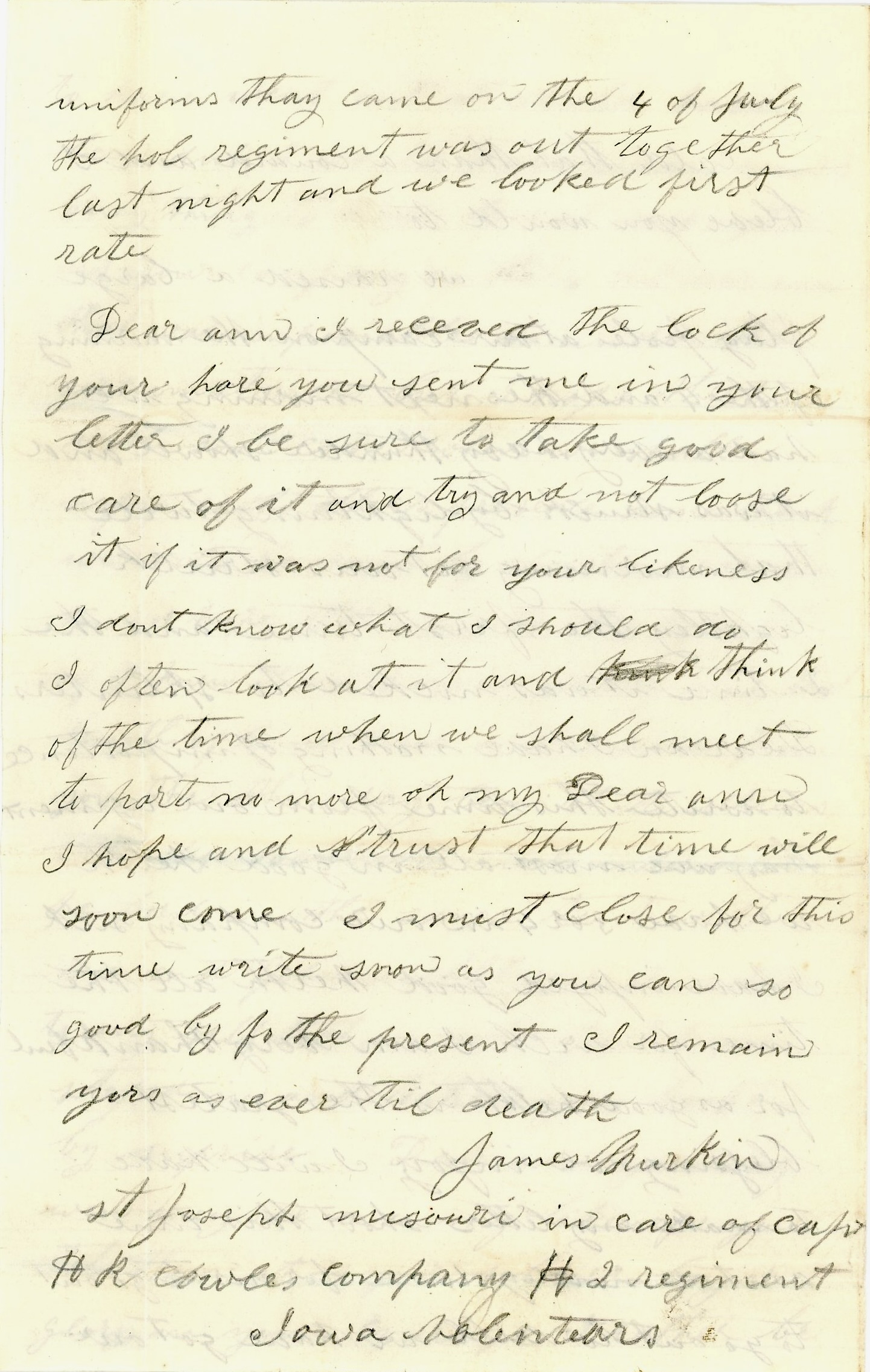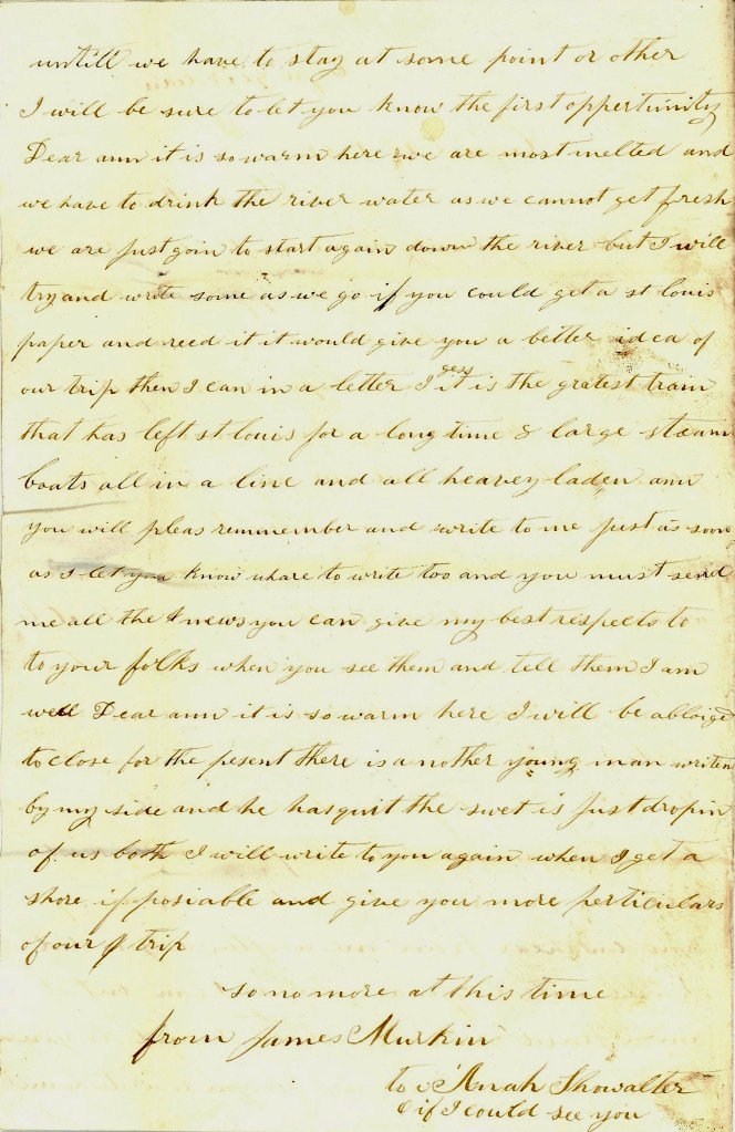 I write a few lines in haste to let you know that we [are] called to start for Hannibal, Missouri. It is now 2 o’clock in the morning. The boys are all in good spirits. Dear Ann, you must excuse me for these few words. I have not time. we was called up out of bed and have to start right away. I will write to you as soon as I can. Yours till death. — James Murkin