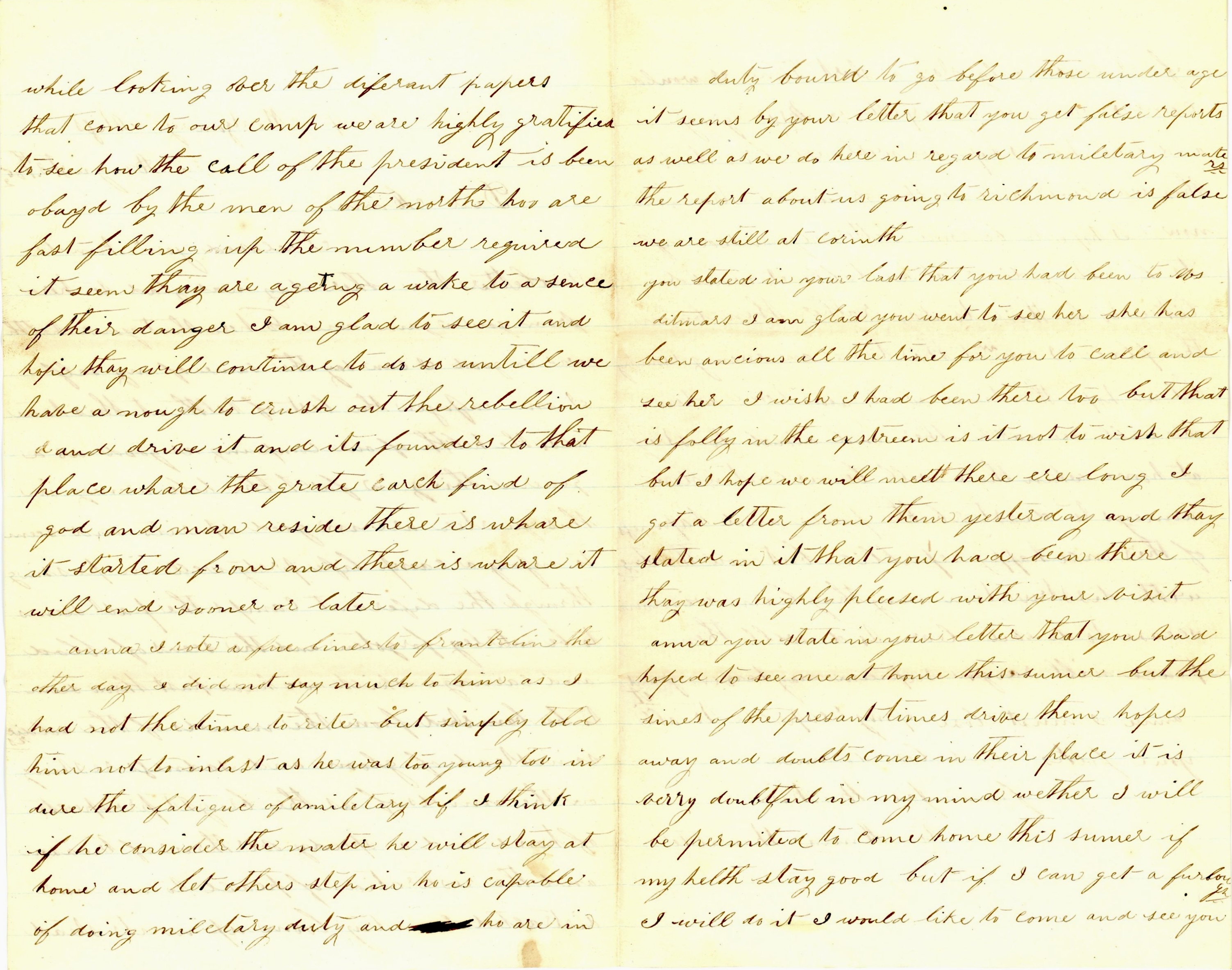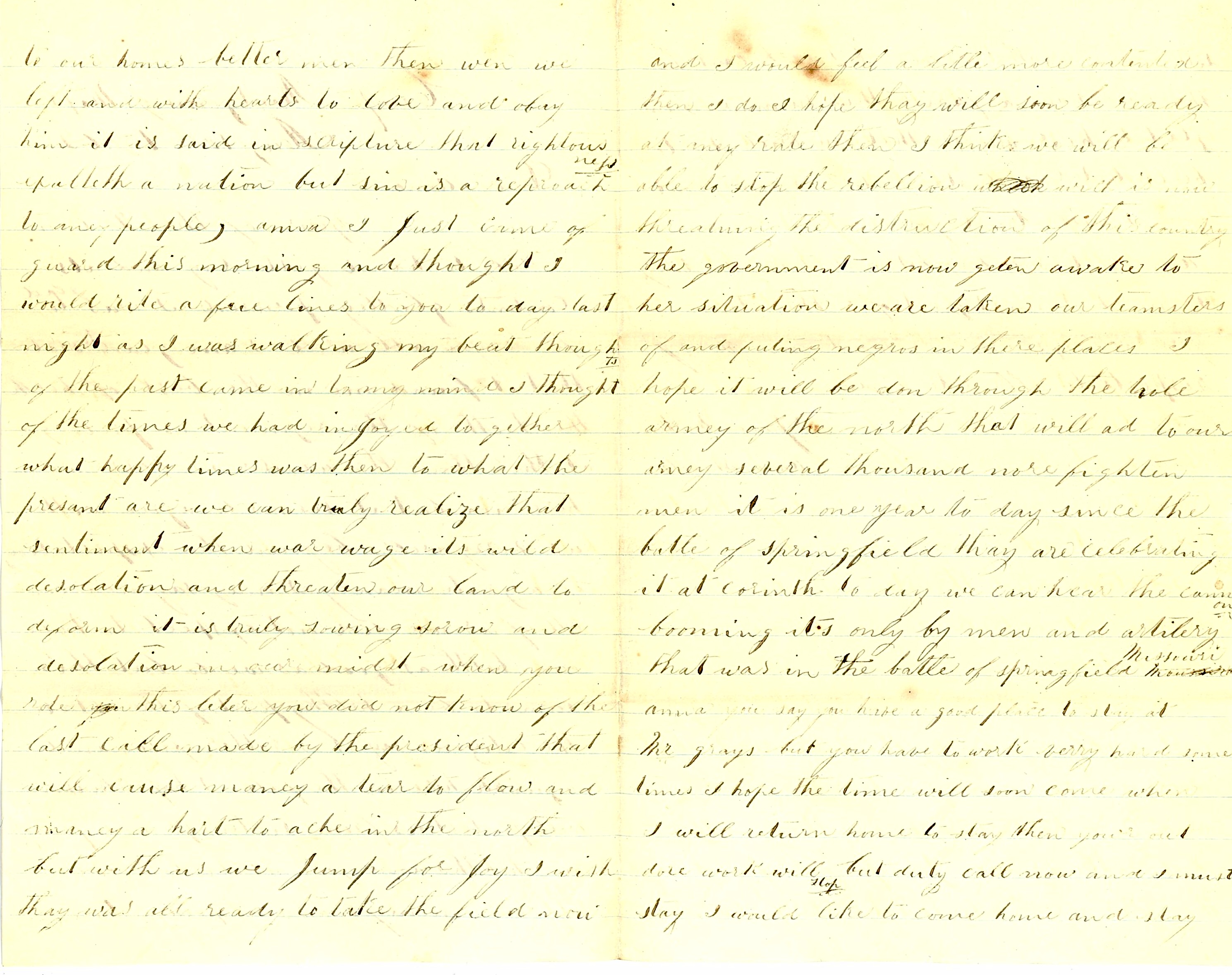 Anna, I just came off guard this morning and thought I would write a few lines to you today. Last night as I was walking my beat, thoughts of the past came in to my mind. I thought of the times we had enjoyed together. What happy ties was then to what the present are. We can truly realize that sentiment when war wages its wild desolation and threatens our land to deform. It is truly sowing sorrow and desolation in our midst, When you wrote this letter, you did not know of the last call made by the President that will cause many a tear to flow and many a heart to ache in the North but with us, we jump for joy. I wish they was all ready to take the field now and I would feel a little more contented than I do. I hope they will soon be ready at any rate. Then I think we will be able to stop the rebellion which is now threatening the destruction of the country. The government is now getting awake to her situation.