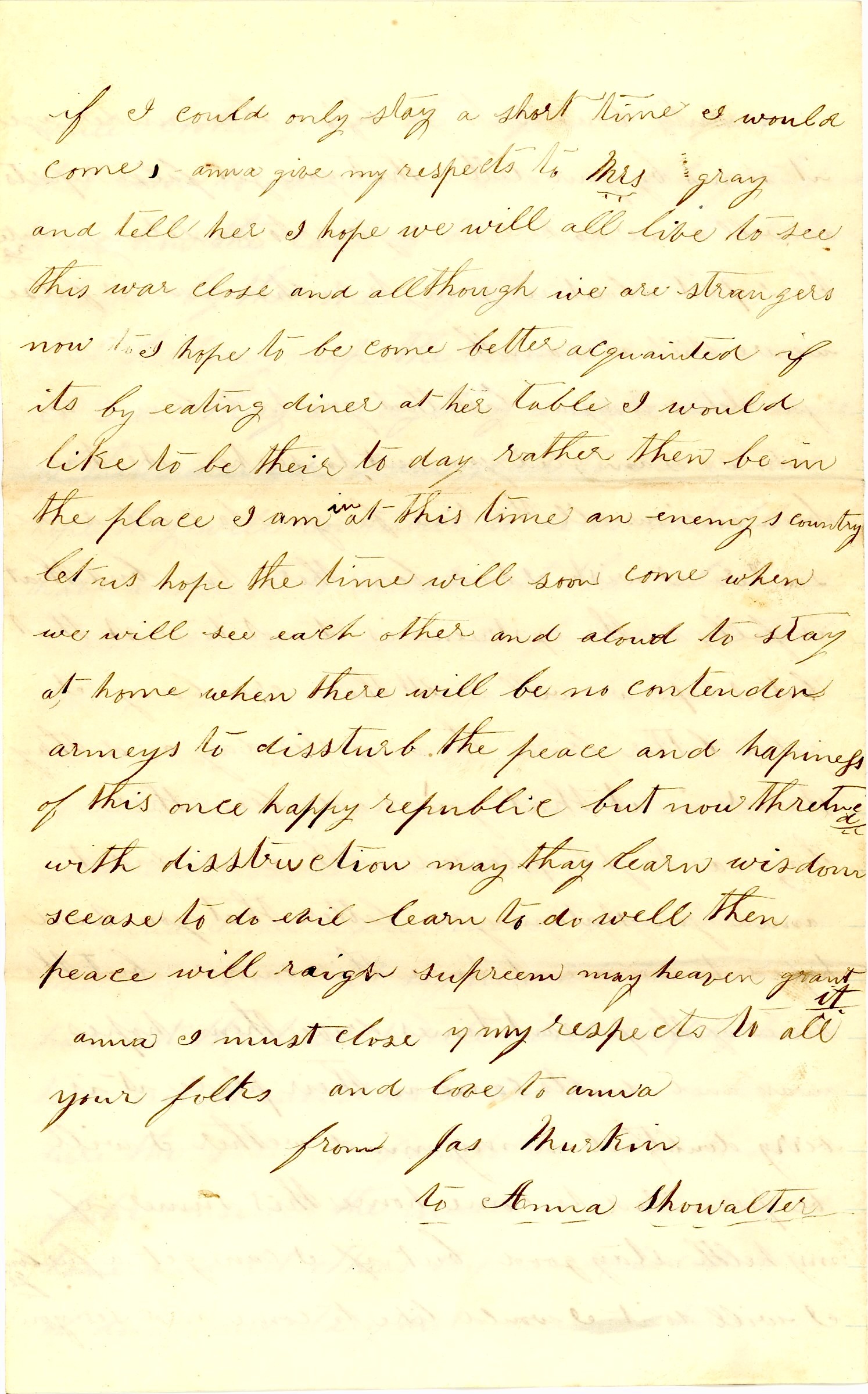 Anna, you state in your letter that you had hoped to see me at home this summer but the signs of the present times drive them hopes away and doubts come in their place. It is very doubtful in my mind whether I will be permitted to come home this summer if my health stay good but if i can get a furlough, I will do it. I would like to come and see you. If I could only stay a short time I would come. Anna, give my respects to Mrs. Gray and tell her I hope we will all live to see this war close. And although we are strangers now, I hope to become better acquainted [even] if it’s by eating dinner at the table. i would like to be there today rather than be in this place. I am in at this time an enemy’s country. Let us hope the time will soon come when we will see each other and allowed to stay at home when there will be no contending armies to disturb the peace and happiness of this once happy republic, but now threatened with destruction. May they learn wisdom, cease to do evil, learn to do well, then peace will reign supreme. May heaven grant it.