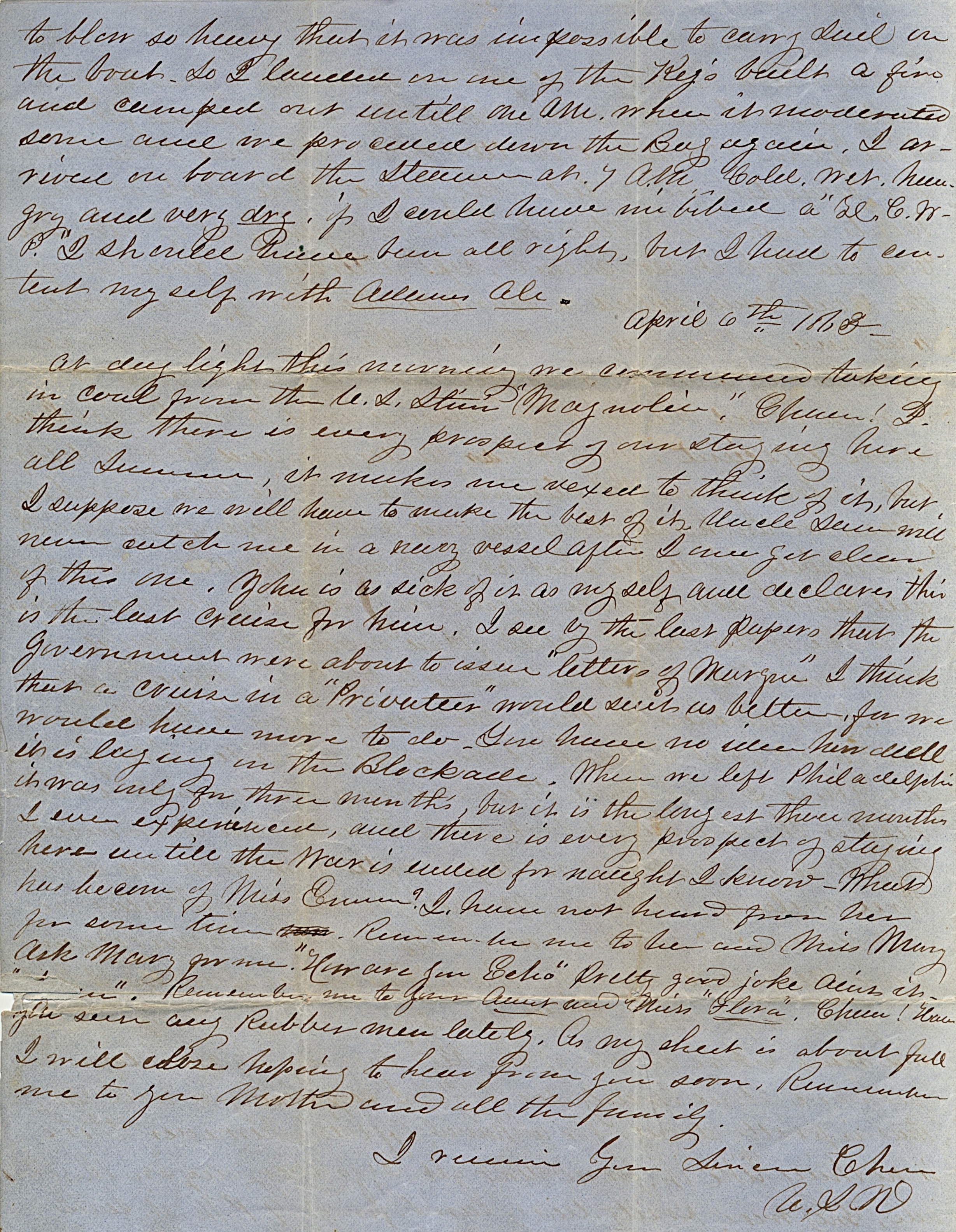 At daylight this morning we commenced taking in coal from the US Steamer Magnolia. Chum! I think there is every prospect of our staying here all summer. It makes me vexed to think of it, but I suppose we will have to make the best of it. Uncle Sam will never catch me in a Navy vessel after I ever get clear of this one. John is as sick of it as myself and declares this is the last cruise for him. I see by the last papers that the government were about to issue “letters of Marque.” I think that a cruise in a “Privateer” would suit us better for we would have more to do. You have no idea how dull it is laying in the blockade. When we left Philadelphia, it was only for three months, but it is the longest three months I ever experienced, and there is every prospect of staying here until the war is ended for naught I know. What has become of Miss Ewen? I have not heard from her for some time. Remember me to her and Miss Mary. Ask Mary for me, “How are you, Echo?” Pretty good joke, ain’t it? Remember me to your Aunt and Miss Flora. Chum! Have you seen any rubber men lately?