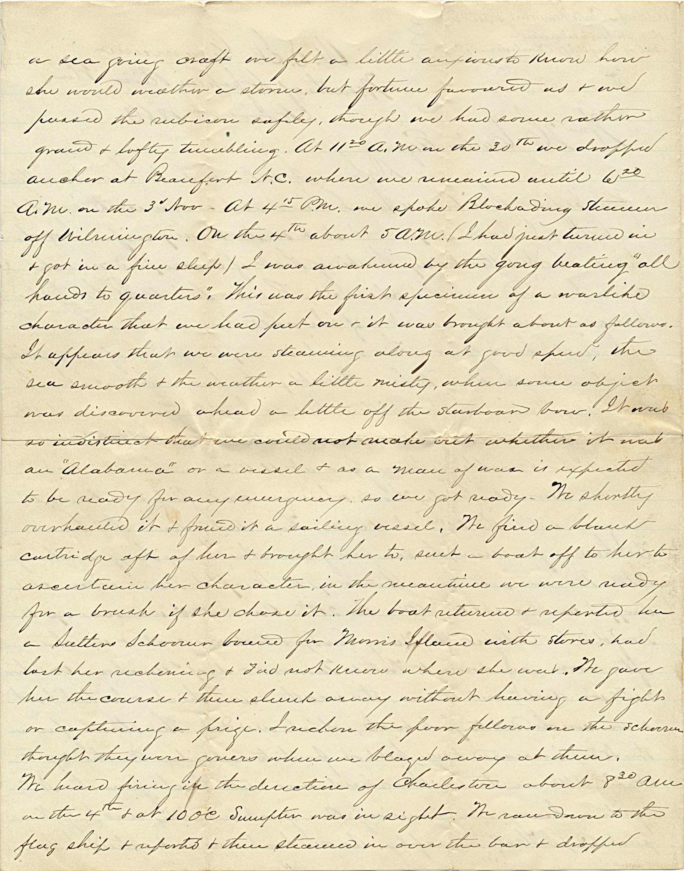 At 11.20 a.m. on the 30th we dropped anchor at Beaufort, North Carolina, where we remained until 6.20 a.m. on the 3rd November. At 4.15 p.m. we spoke Blockading steamer off Wilmington. On the 4th about 5 a.m. (I had just turned in and got in a fine sleep), I was awakened by the gong beating “all hands to quarters.” This was the first specimen of a warlike character that we had put on. It was brought about as follows. It appears that we were steaming along at good speed, the sea smooth & the weather a little misty, when some object was discovered ahead a little off the starboard bow. It was so indistinct that we could not make out whether it was an “Alabama” or a vessel & as a man-of-war is expected to be ready for any emergency, so we got ready.