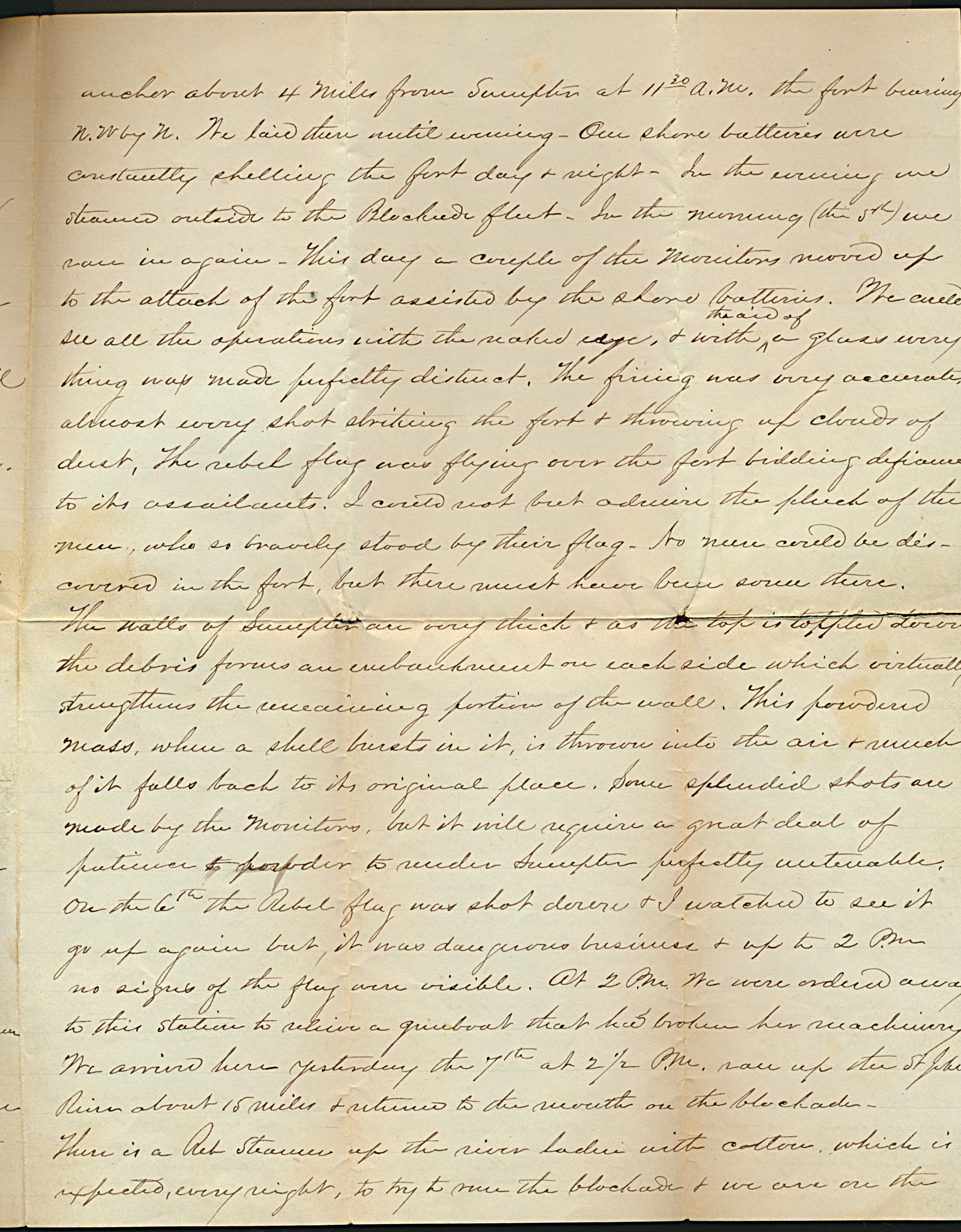We heard firing in the direction of Charleston about 8.30 on the 4th & at 10 o’clock [Fort] Sumter was in sight. We ran down to the flag ship & reported & then steamed in over the bar & dropped anchor about 4 miles from Sumter at 11.30 a.m., the fort bearing N. W. by N. We laid there until evening. Our shore batteries were constantly shelling the fort day and night. In the evening we steamed outside to the blockade fleet. In the morning (the 5th) we ran in again. This day a couple of the monitors moved up to the attack of the first assisted by the shore batteries. We could see all the operations with the naked eye & with the aid of a glass everything was made perfectly distinct. The firing was very accurate—almost every shot striking the fort & throwing up clouds of dust. The rebel flag was flying over the fort bidding defiance to its assailants. I could not but admire the pluck of the men who so bravely stood by their flag. No men could be discovered in the fort but there must have been some there.