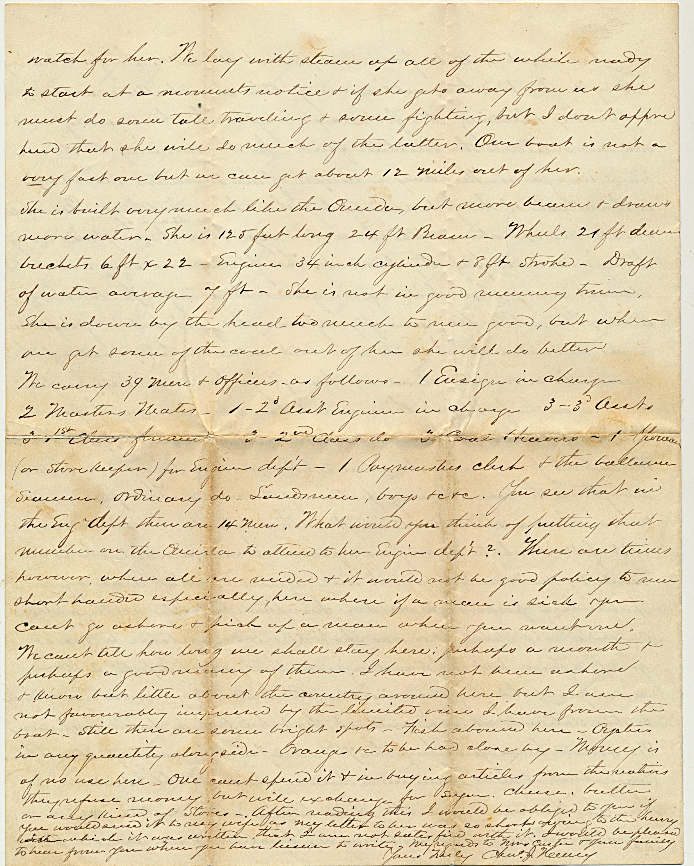 Our boat is not a very fast one but we can get about 12 miles out of her. She is built very much like the Oneida, but more beam and draws more water. She is 125 feet long, 24 foot beam. Wheels 21 feet draw buckets 6 feet x 22. Engine 34 inch cylinder & 8 foot stroke. Draft of water averages 7 feet. She is not in good running trim. She is down by the head too much to run good, but when we get some of the coal out of her, she will do better. We carry 39 men & officers as follows. 1 Ensign in charge 2 Master Mates, One 2d Asst. Engineer in charge. Three 3d Assistants. Three 1st Class Firemen, Three 2nd class Firemen. Three coal heavers. One Storekeeper for Engine dept. One Paymaster’s Clerk & the balance seamen, ordinary seamen, landman, boys &c. You see that in the Engineering Department, there are 14 men. What would you think of putting that number on the Oneida to attend to her Engine Department? There are times, however, when all are needed & it would not be good policy to run short handed—especially here where if a man is sick, you can’t go ashore & pick up a man when you want one.