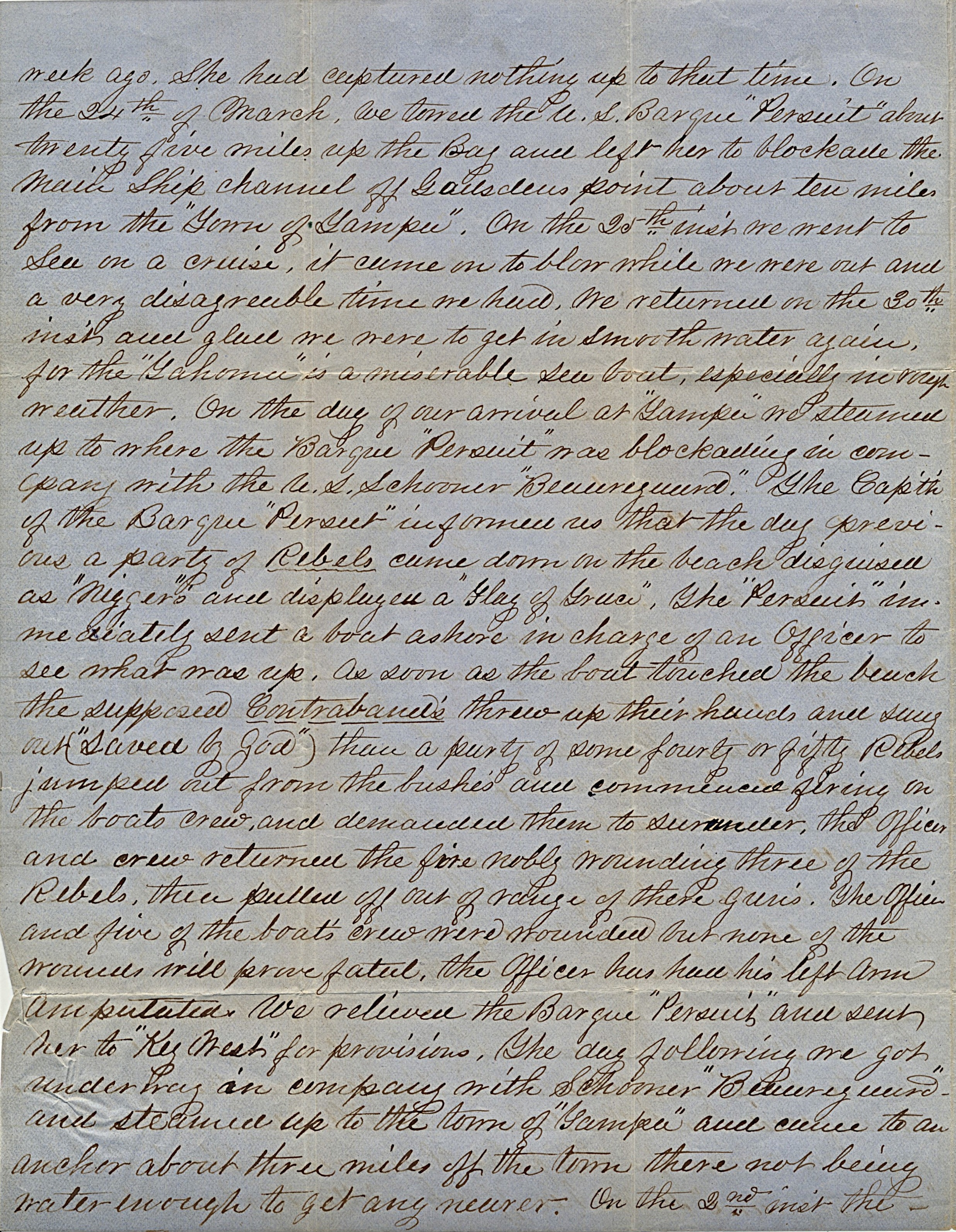 On the day of our arrival at Tampa, we steamed up to where the Barque Pursuit was blockading in company with the US Schooner Beauregard. The Captain of the Barque Pursuit informed us that the day previous, a party of Rebels came down on the beach disguised as “Niggers” and displayed a Flag of Truce. The Pursuit immediately sent a boat ashore in charge of an officer to see what was up. As soon as the boat touched the beach, the supposed Contrabands threw up their hands and sang out (“Saved, by God”). Then a party of some 40 or 50 Rebels jumped out from the bushes and commenced firing on the boat’s crew and demanded them to surrender. The officer and crew returned the fire nobly, wounding three of the Rebels, then pulled off out of range of their guns. The officer and five of the boat’s crew were wounded but none of the wounds will prove fatal. The officer has had his left arm amputated. 1, 2